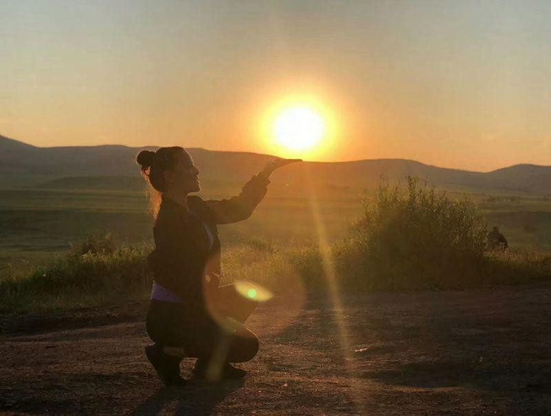 晚饭后,经过10分钟的车程我们来到一处山脚下,沿着平缓的山坡带着相机,气喘吁吁,一路往坡顶走去。爬到山顶可见一群摄影爱好者早已架起“长枪短炮”等待日落……此时,草原上笼罩着金色的寂静,远处山峦披上晚霞的彩衣,那天边牛乳般洁白的云朵也变得火带一般鲜红。夕阳无限好,最美在黄昏。