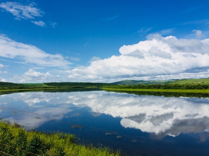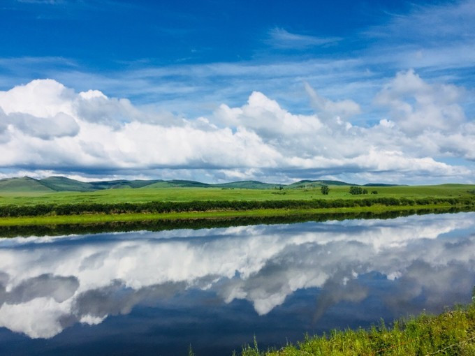 它把蓝天与白云都倒影其中。而两岸的草原都是清翠一片,这里充满的生机。