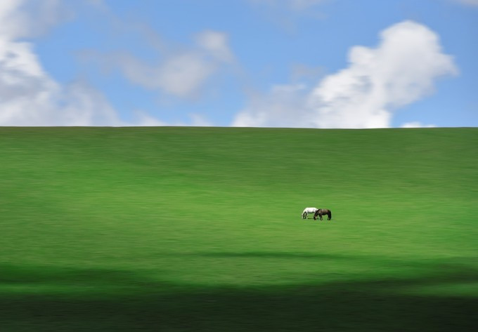 那两匹正在吃草的马儿,正在优哉游哉的享受日子。
