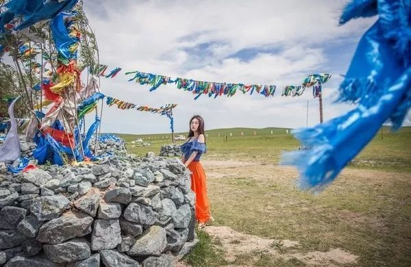 五彩的哈达点缀着敖包。我们将拇指向内四指合拢,许下心愿围绕敖包走三圈,每到起点处要向空间抛块小石块。草原牧民用这样的祭祀祈求风调雨顺,来到这里的我们也期盼着神灵能听到我们的祈愿。