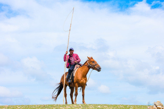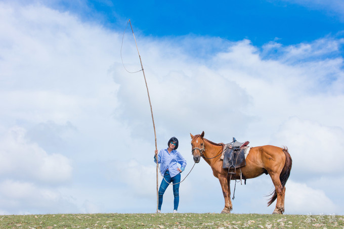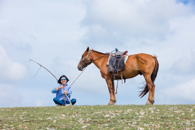 起初我们对这个身材高大的“朋友”还是满怀芥蒂,很怕它不知名的“小脾气”会伤到我们,慢慢的发现这匹枣红马真的很温顺,好像也很喜欢跟我们这些人类一起合影的样子,结果我们放松大了,牧马人看着我们这些城里人好玩,竟然把套马杆也借给我们当道具,当时大家都快乐疯了, 蒙古 族果然豪爽实在。