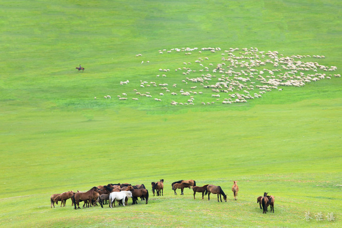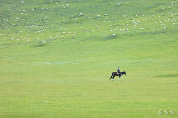 牧羊人也有自己的职责,在我们尽兴之后,远远望着牧羊人骑着枣红马帅气的去追赶羊群。盛夏的草原深处,牧草正在茂盛生长,就像城里人工种植的草坪一样工整,别怀疑草为什么这么矮,畜群每天都会在这里经过,每天吃一遍,不然相信也会像那首诗一样:“风吹到底现牛羊”,