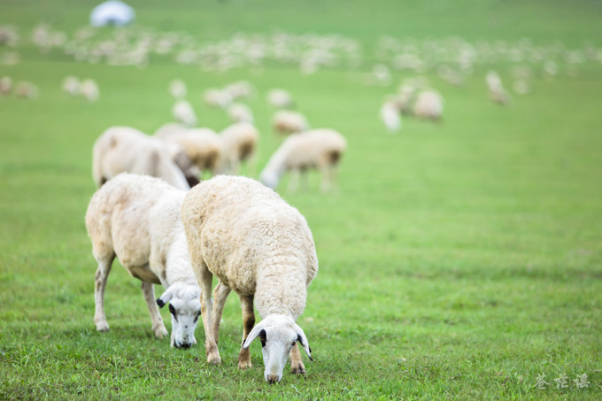 在公路上行驶了一段,我们便下路继续往草原深处辗转,走的是土路,有一些颠簸,还好用的是越野车。这里没有高楼大厦,没有铺装道路,没有熙熙攘攘,也没有门票,有的只有自然的美与和谐,蓝天白云,碧草连天,跟想象中的完全一样,当你真切置身在其中的时候,你会被她的美深深迷醉,行驶不远就看到成群的羊在无忧无虑的啃食青草,牧马人拿着套马杆骑着高头大马在巡视着他的畜群。