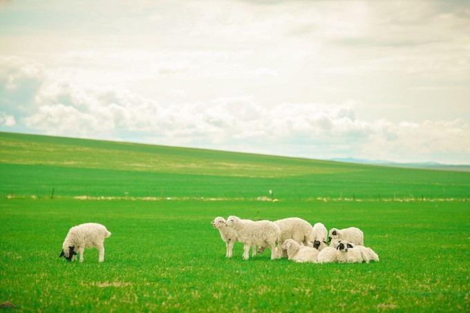 继续往前开车,我们看到在无际的草原上,有一群羊,仿佛一大片云,盖住了一片原野。