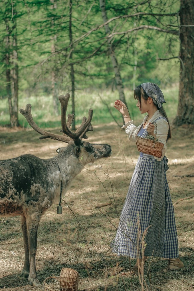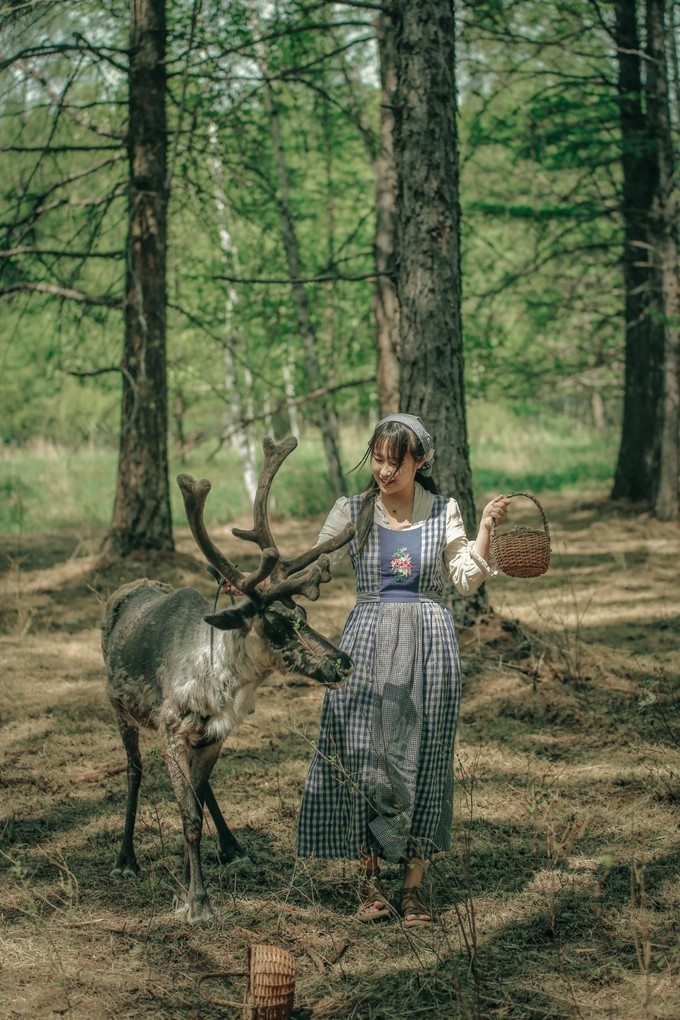 所以,一开始拍的喂鹿场景,我都是被完美KO的,要不就是被两只驯鹿逼到了树干上动弹不得,大的那一只抬起头都快凑我嘴上了,小的那只用鹿角把我的裙子给掀起来了,崩溃!