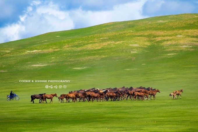 许多人对于草原的向往都是源于课本上的这首诗,六月初的内蒙还未到全盛景观,某些山头还是光秃秃的,但这也丝毫不降低我对大草原的半分喜爱。这最丰美的草原牧场,拥有最纯洁的蓝天、白 云和 最优质的牧草,乘车穿越途中牛羊成群,蔚为壮观。心中默念:嗯,是我想象中的 呼伦贝尔 !