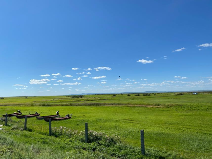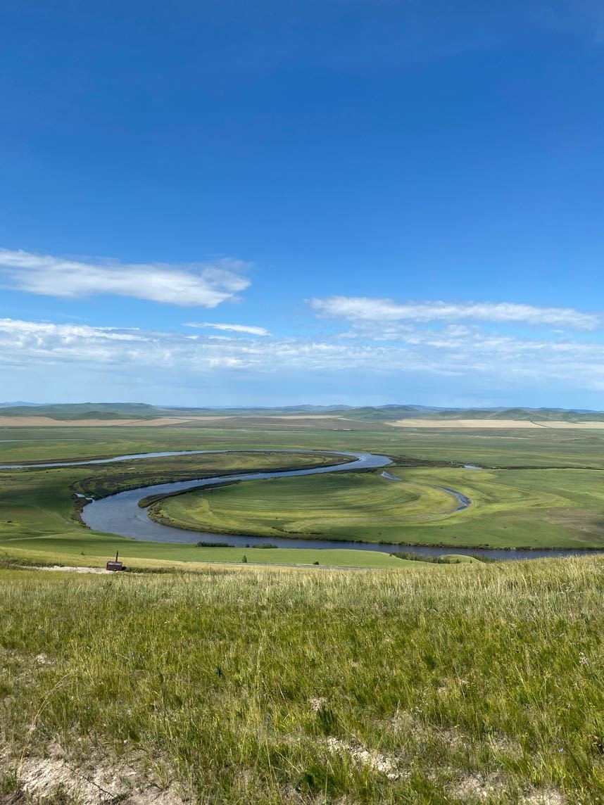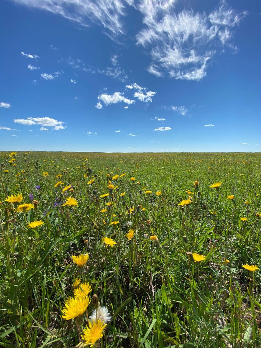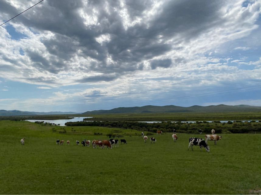 这次旅行相关的人文景观结束了,真正的呼伦贝尔的大草原之旅开始了!由于公路紧邻俄罗斯边境,怕手机定位飘到俄罗斯,为避免健康码变黄影响回程,所有人都把手机调成了飞行模式。车行驶在路上,窗外就是辽阔的大草原,牛群悠闲地吃着草,有时候它们就站在路上一动不动,师傅只好无奈的绕开它们。途经一片开满黄花的草地,在蓝天白云的印衬下美极了,大家在草地上躺着趴着坐着玩得不亦乐乎。