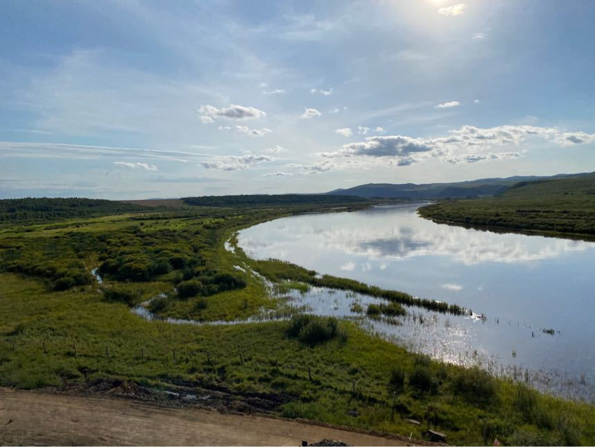 沿途会经过33湿地和186彩带河,美景不容错过。爬上一座牛群和牛粪遍地的小山坡就能远远眺望33湿地,之所以叫33湿地,是因为这里离俄罗斯的一个小镇只有33公里,是个跨界于中俄边境上的一片湿地。额尔古纳河弯弯曲曲,静静流淌至远方。