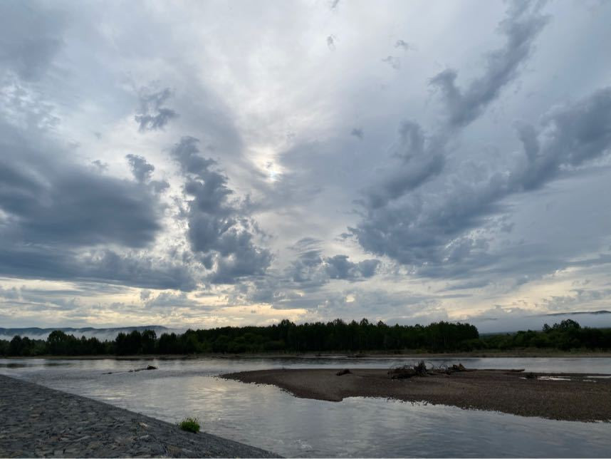 第五天,清晨跟大哥两口子沿着根河边散步,远处群山脚下的晨雾美极了。