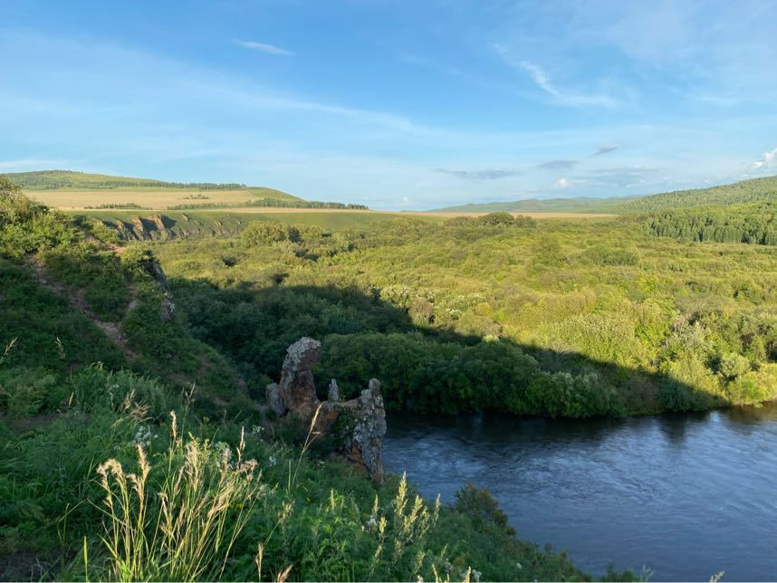 第三天,黑头山至临江屯,第一站乌兰山景区,乌兰山是额尔古纳河畔最高峰,伫立着远古第一座敖包和最古老的敖包群落,登山望远,能看到境外俄罗斯的小镇,山脚下的额尔古纳河流经此处自然形成了一处美妙的太极图形。