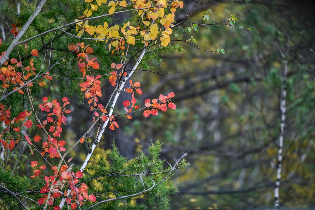 也许这些红色与黄色是视觉上的错觉,于是我走在跟前仔细的看了下树上的叶子,果然是红色与黄色相间的。在这个季节的大兴安岭,居然有红、黄与绿三色争艳的景色,这种感觉太好了。不知道你们是不是也喜欢这种多色同时存在的风光,如果喜欢可以来这里亲身体验一下。