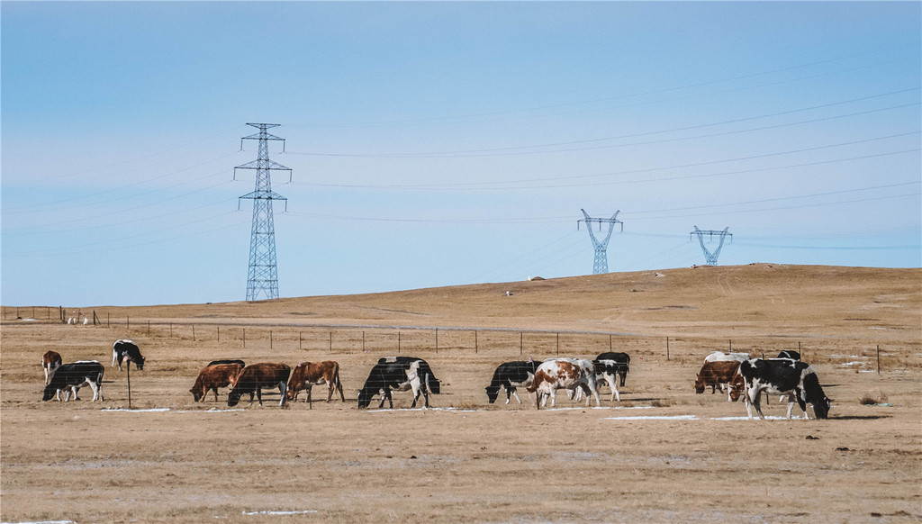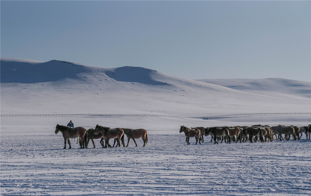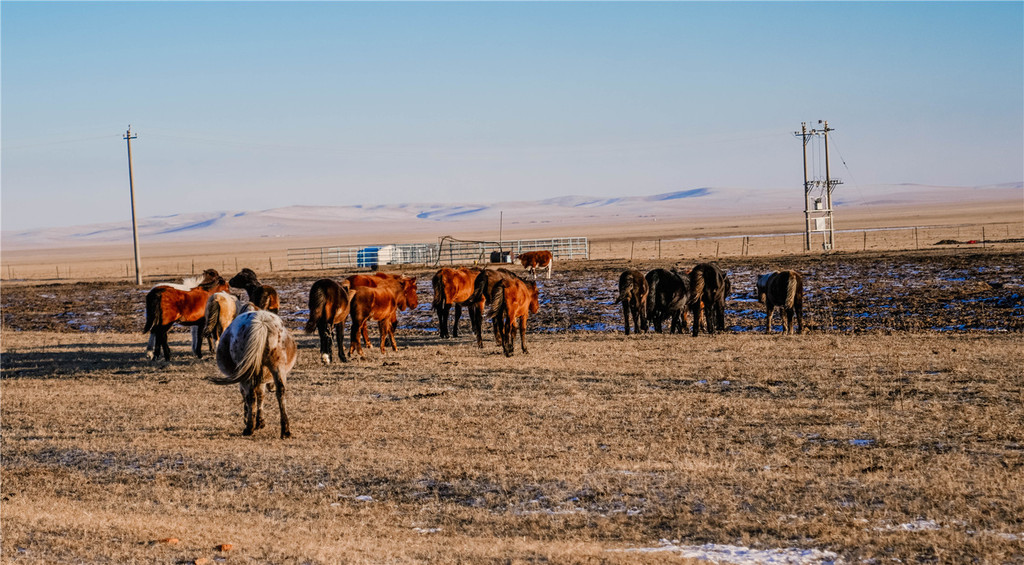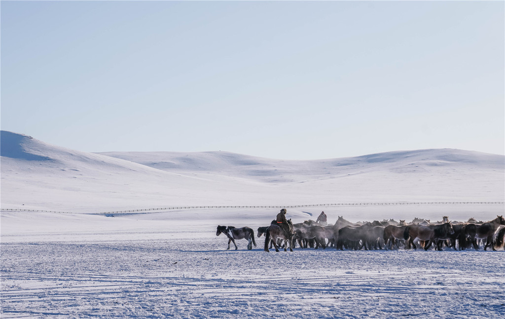 在雪原上还有牧民们放养的牛群和马群,它们或许会从油柏路上经过,远远看见这些小可爱就开始放慢车速要给它们让道。