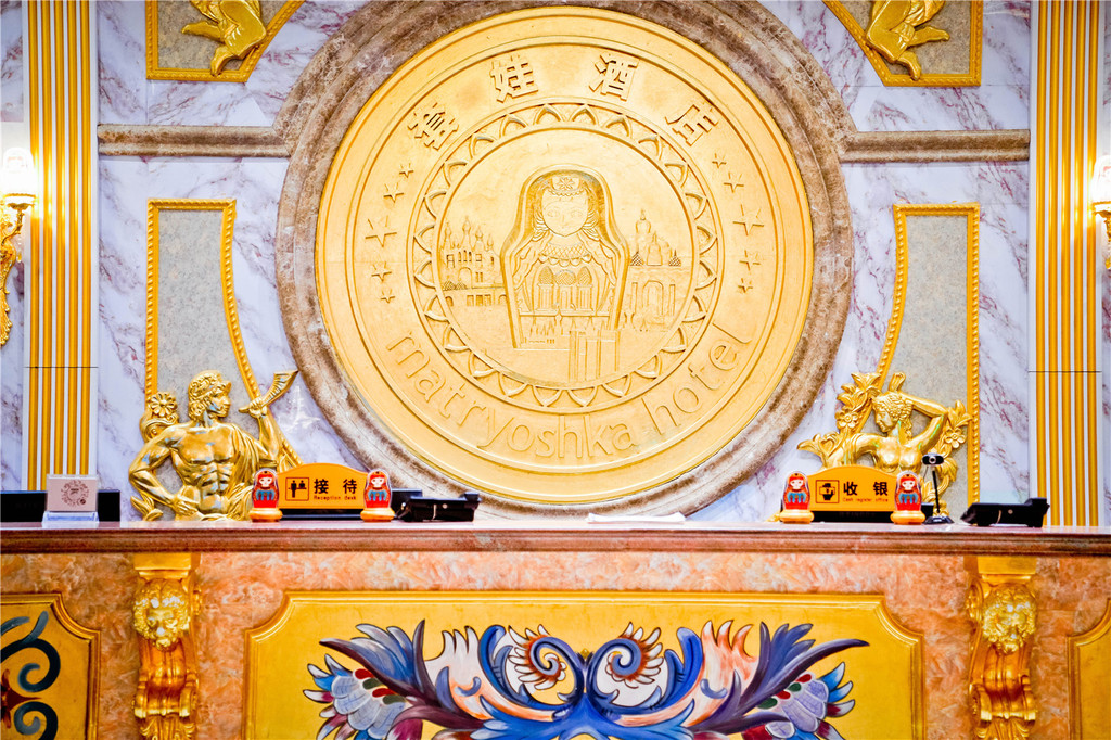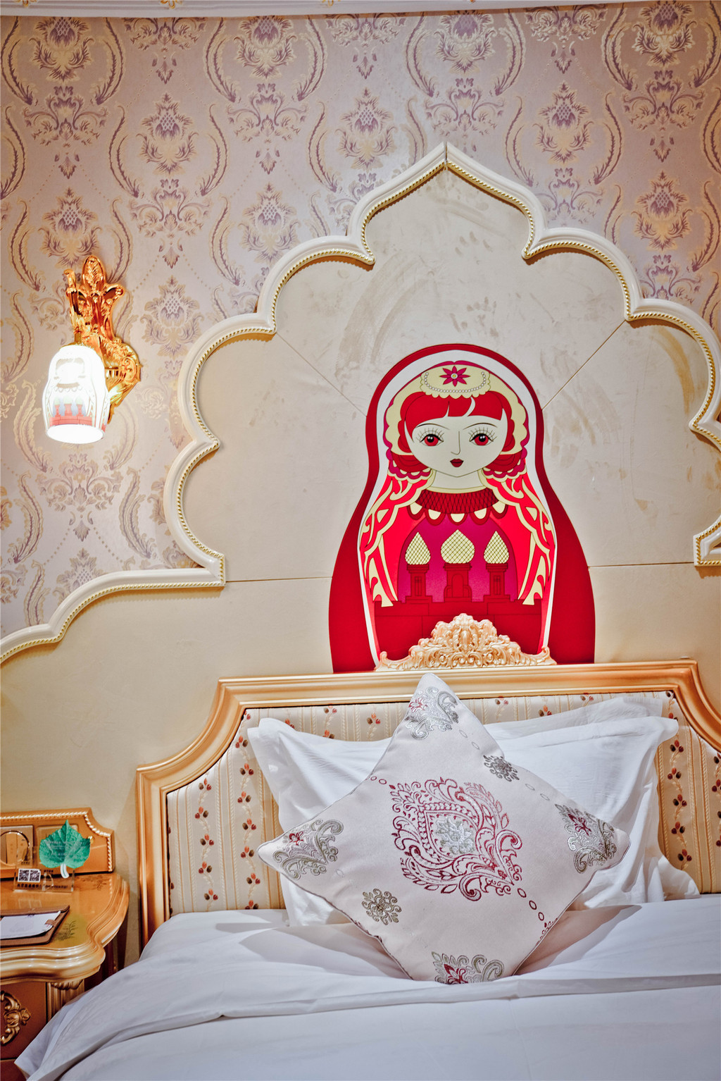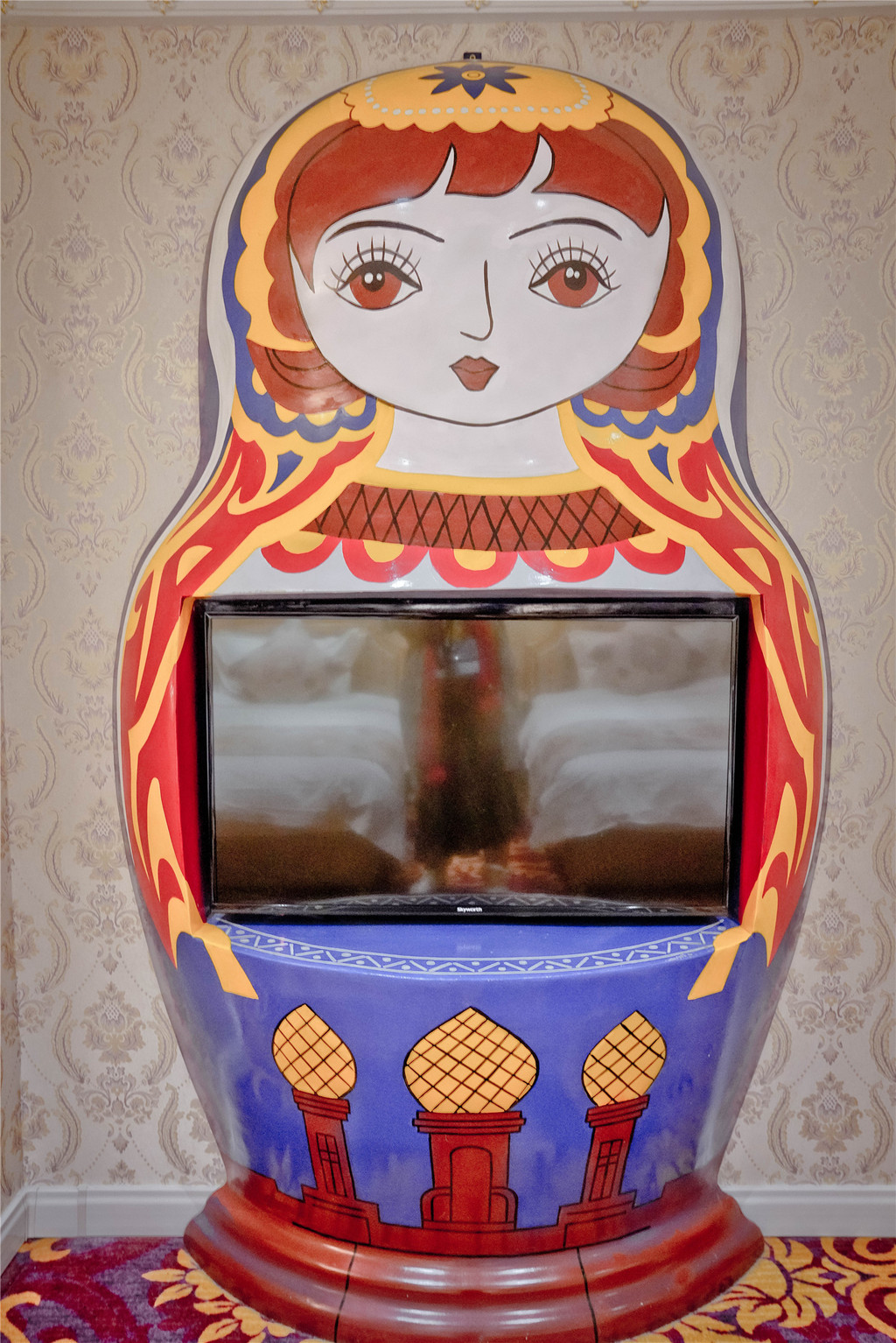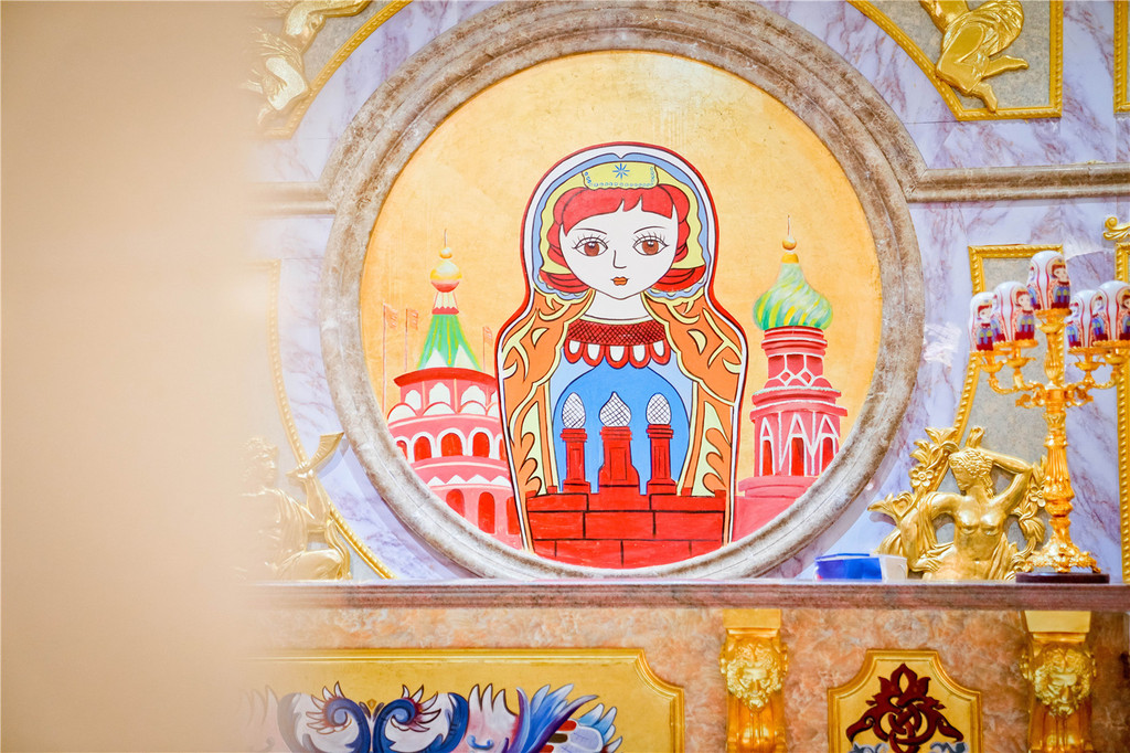 套娃主题的酒店,隐藏在酒店里的套娃痕迹数不胜数,不仅仅是酒店的外观,还有在壁画,壁灯和围栏上的灯罩都是套娃的图案。走进房间里面更是处处都有套娃的惊喜,大到摆放电视机的壁柜,洗水间的镜子,小到放在桌子上的水瓶都是套娃,而我觉得最有趣的就是热水壶和水杯竟然也是陶瓷定制的套娃,巧妙的心思体现到在细节里面。