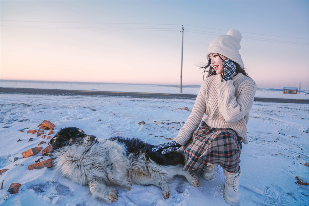我们兴奋地下车拍照,没过多久突然有几条狗冲了过来向我们狂吠,我们被吓得惊慌失措,以为是我们闯进了陌生地带,狗狗们不欢迎我们呢。后来看见它们兴奋地对我们摇尾巴,一点都没有恶意。原来这些狗狗们都是牧民养的,或许在冬日里很少有过客,遇到我们都兴奋地一群簇拥而上。