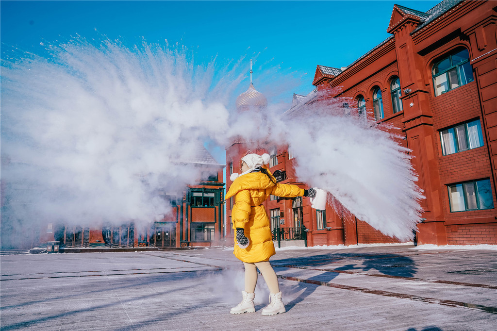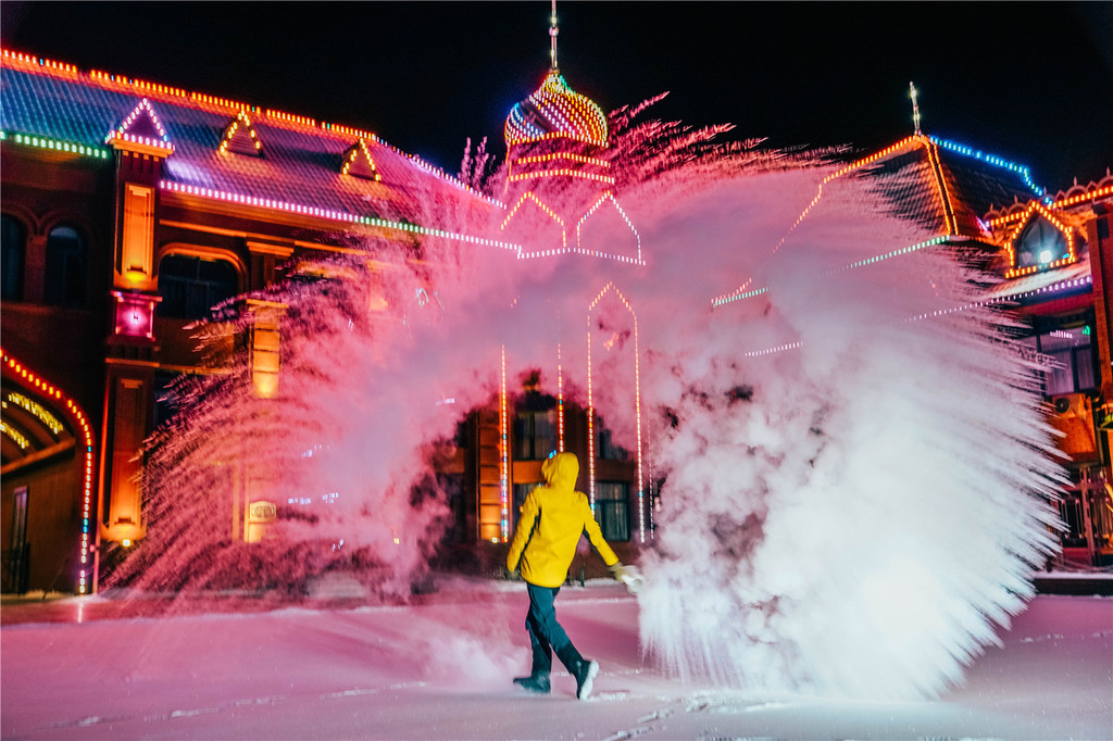 想起这趟 呼伦贝尔 之旅我们还没有泼水成冰呢,只有在这零下的温度能实现泼水成冰的美感,于是我和小伙伴们一起玩闹起来,我们在雪中在俄式建筑酒店前,绚丽多彩的灯光下,拍出了如此梦幻的泼水成冰照片。