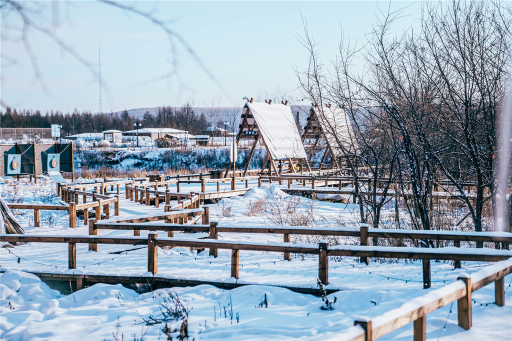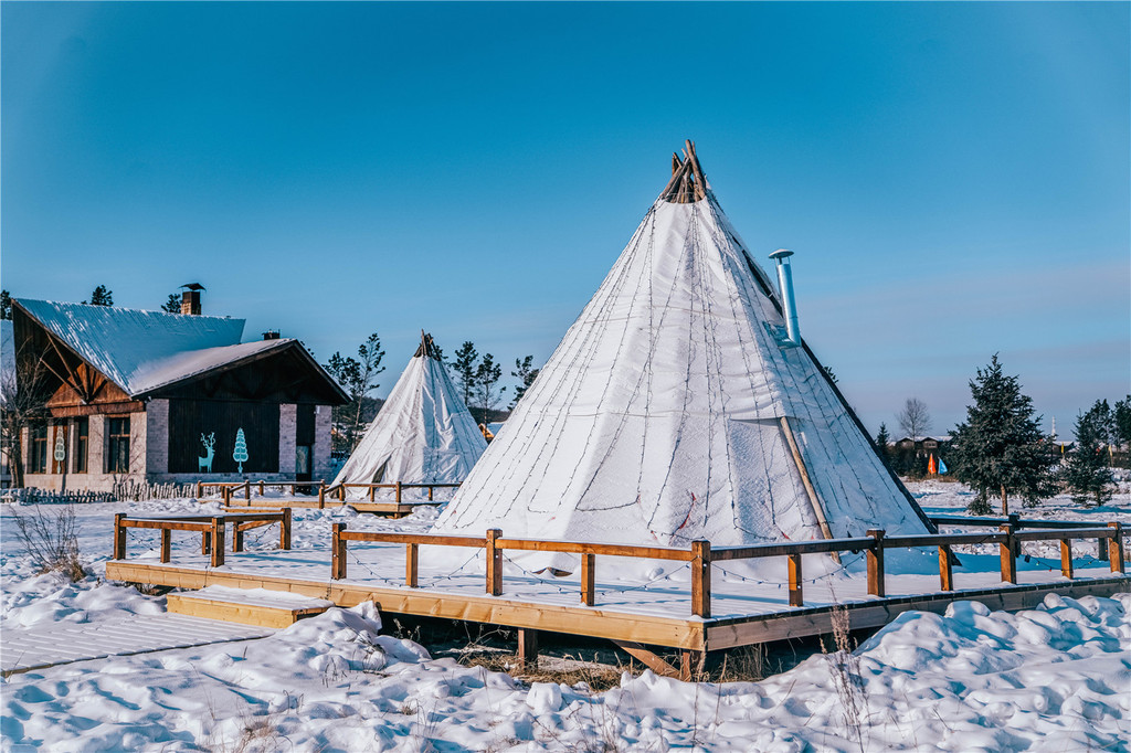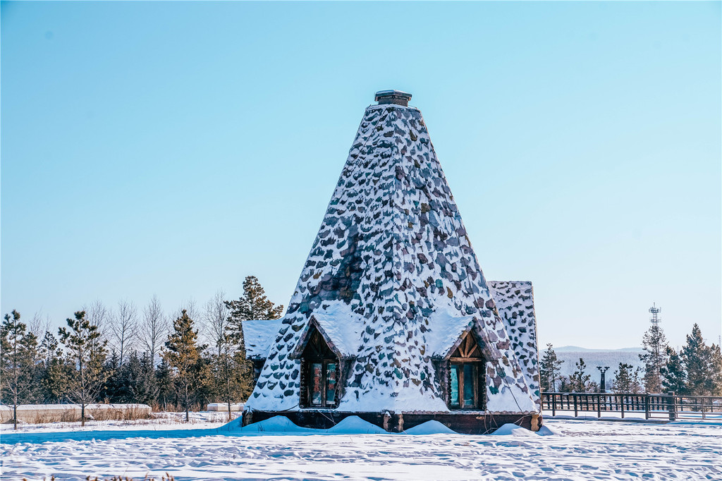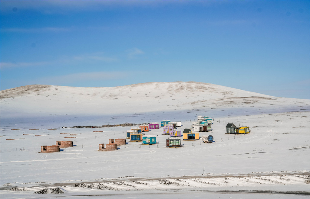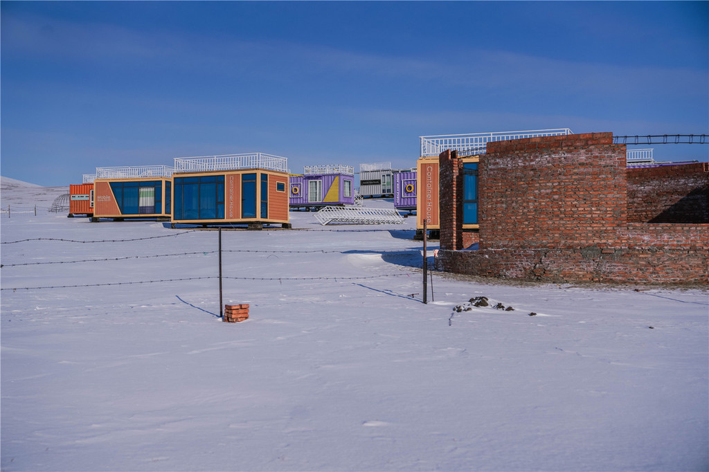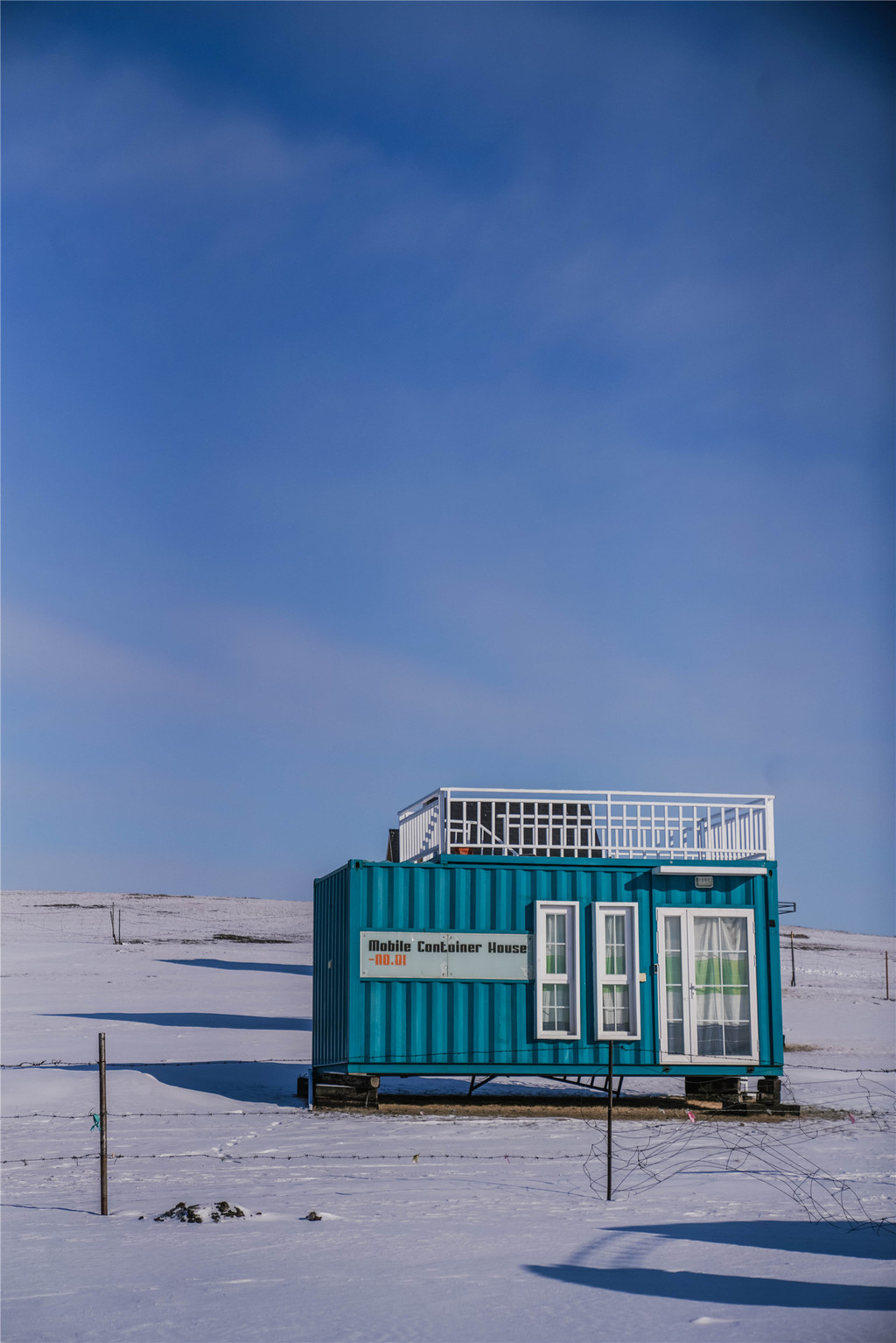 开进雪原深处后,远远地就看到一个个集装箱坐落在雪地山坡上,红的黄的蓝的箱子原来是一个个房间,聚集形成了一个集装箱酒店,如果是在夏季打开门就是风吹草低见牛羊的风景,而如今只剩下白茫茫的雪景,彩色的集装箱就像一颗颗糖果散落在银装素裹的世界,在渺无人烟的环境中,如果不是深入雪原不会有人注意到它们的存在。