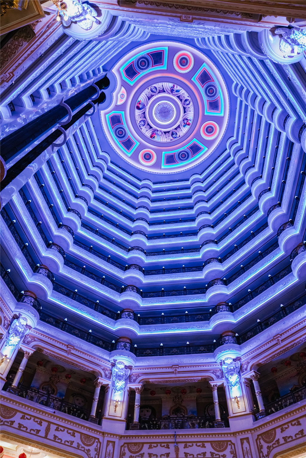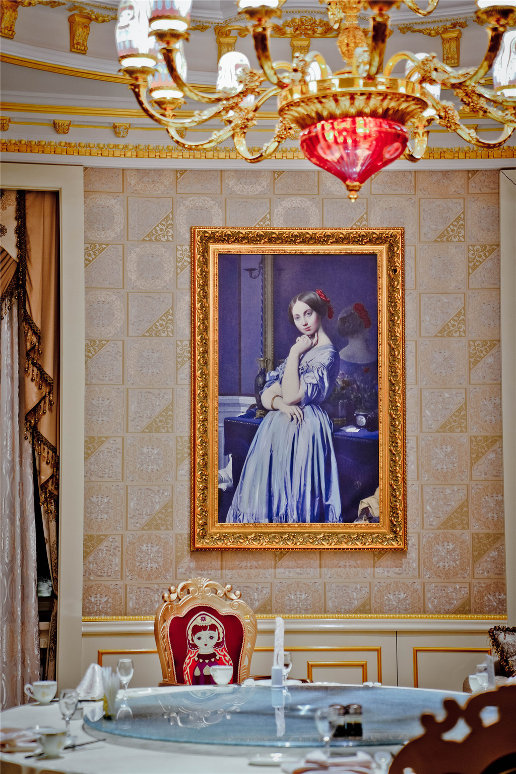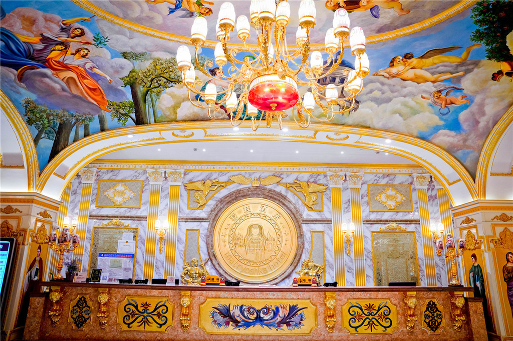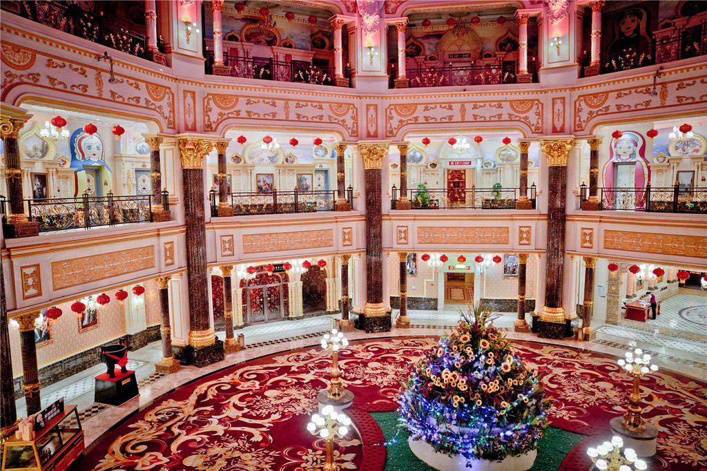 和酒店大堂连通的一条走道上,会看到许多俄式风格的油画,布满墙壁和天花板,水晶吊灯洒落温暖的微光,朦胧的金碧辉煌中带着一丝丝复古的氛围,漫步其中犹如走进艺术博物馆里面,根本想不到这会是一家酒店。