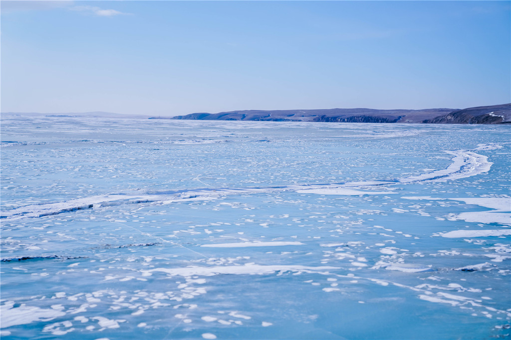 呼伦湖非常大,大到望向湖的方向时完全看不到尽头,与天相接的地方还是冰湖,湛蓝的天空没有一丝瑕疵,冰湖上面大概受风力的作用,冰面被吹得凹凸不平。而是偶尔出现小小的坑洼或是裂痕,这种凹进去的坑洼和裂痕里面藏着白色的积雪,其它藏不住的积雪都被狂风吹送着掠过冰面飘向远方。