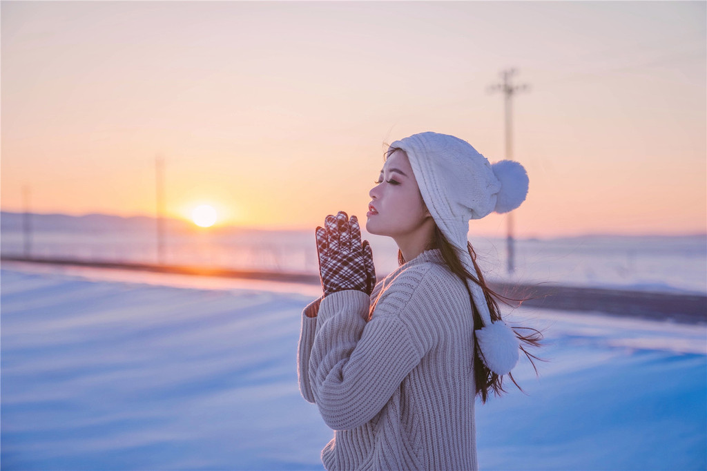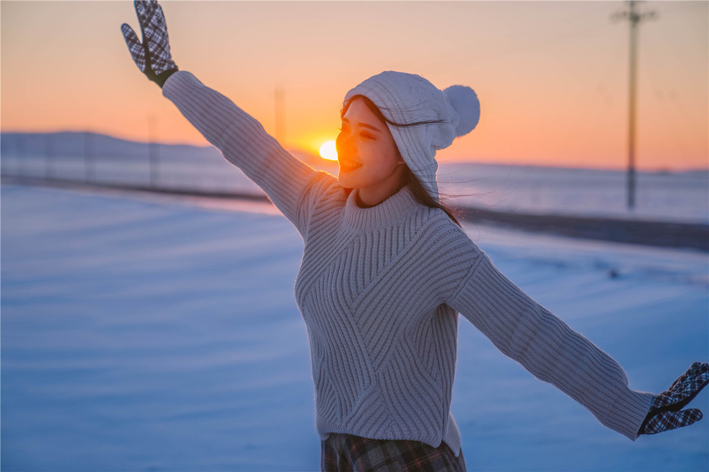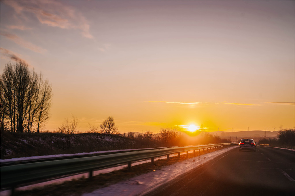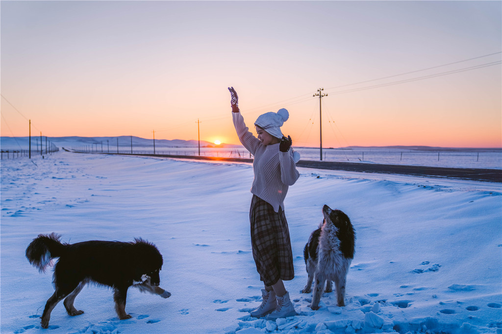 本来想赶在日落前到达 黑山 头观看日落,但是计划赶不上变化,但旅途中除了以后还有小惊喜,在一望无际的边境线公路上,我们遇到了一所孤独的木屋,天边的颜色被夕阳熏染成粉红,就像安静的童话世界,夕阳的余晖撒在一片雪原中,我和闺蜜说,此刻不如来欣赏一场积雪世界上的日落吧。