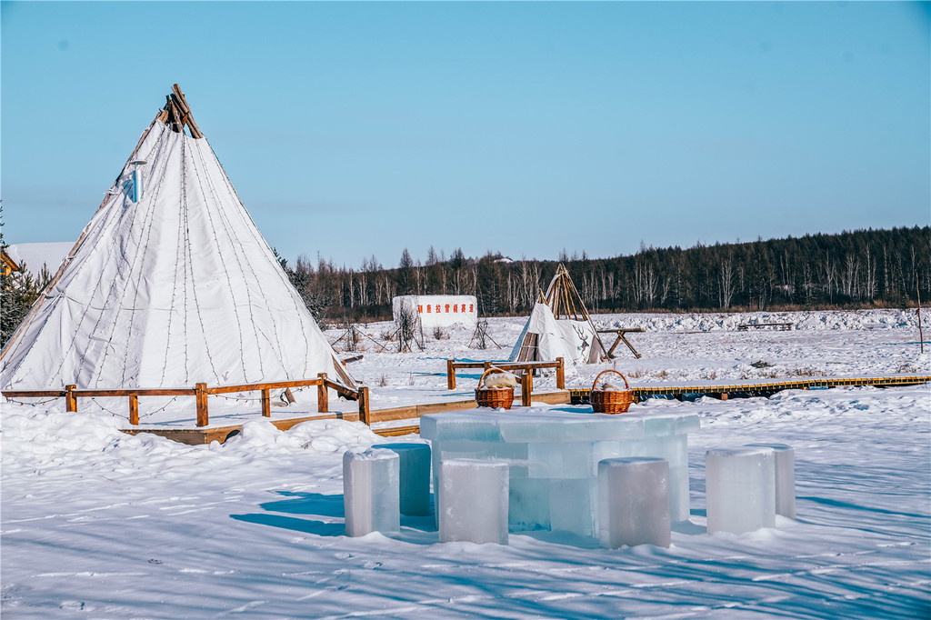 走进驯鹿苑,冰砖砌成的圆桌和椅子非常有趣,摆放在桌面上的竹篮盛着喂养驯鹿的食物,有大白菜和橙子葡萄等水果,只是都已经冻成冰块了。
