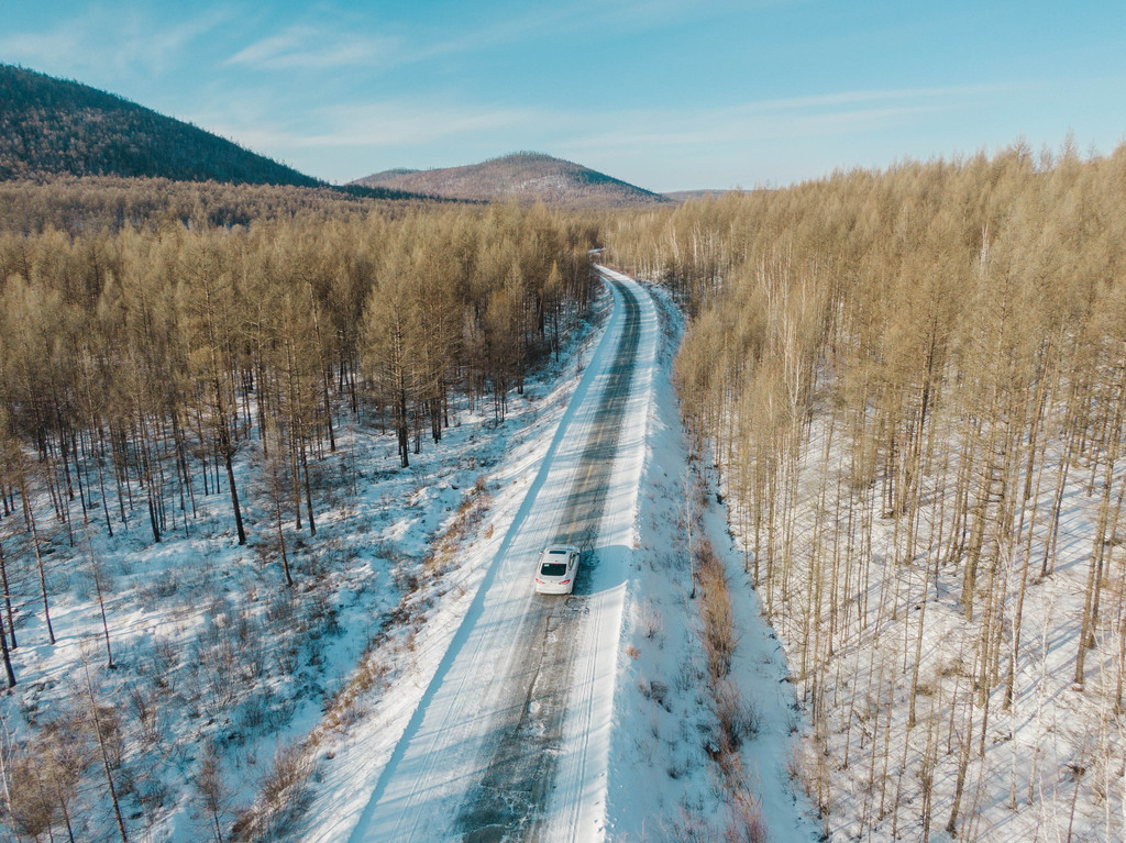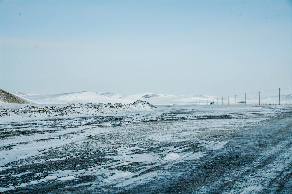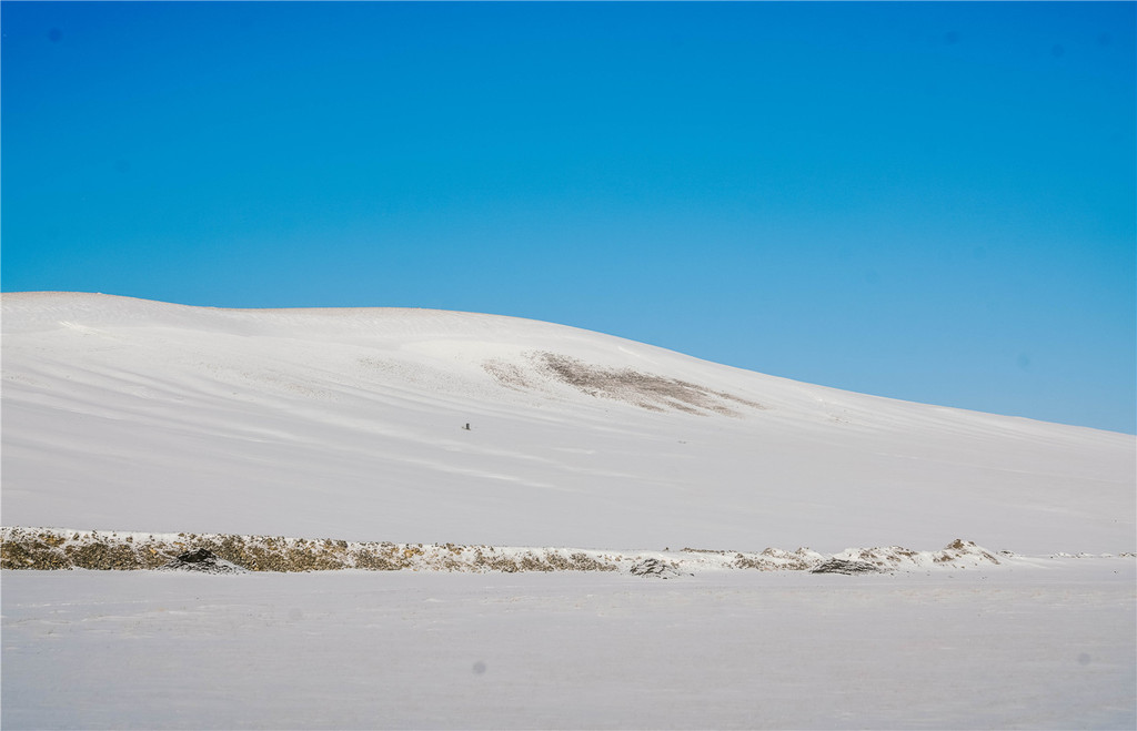 从水泥道路转入行驶在积雪上,才有种真正融入雪景的感觉,雪白和天际的蓝色连接在一起,不远处的山丘也是一片白色,从倒后镜往走过的雪地上看,雪白无痕的雪地上留下几条明显的车辙痕迹。在雪地里行驶的时候,需要十分小心,跟随别的车辆留下的车辙行驶,不然很容易遇到积雪厚的地方轮胎陷在里面进退两难。