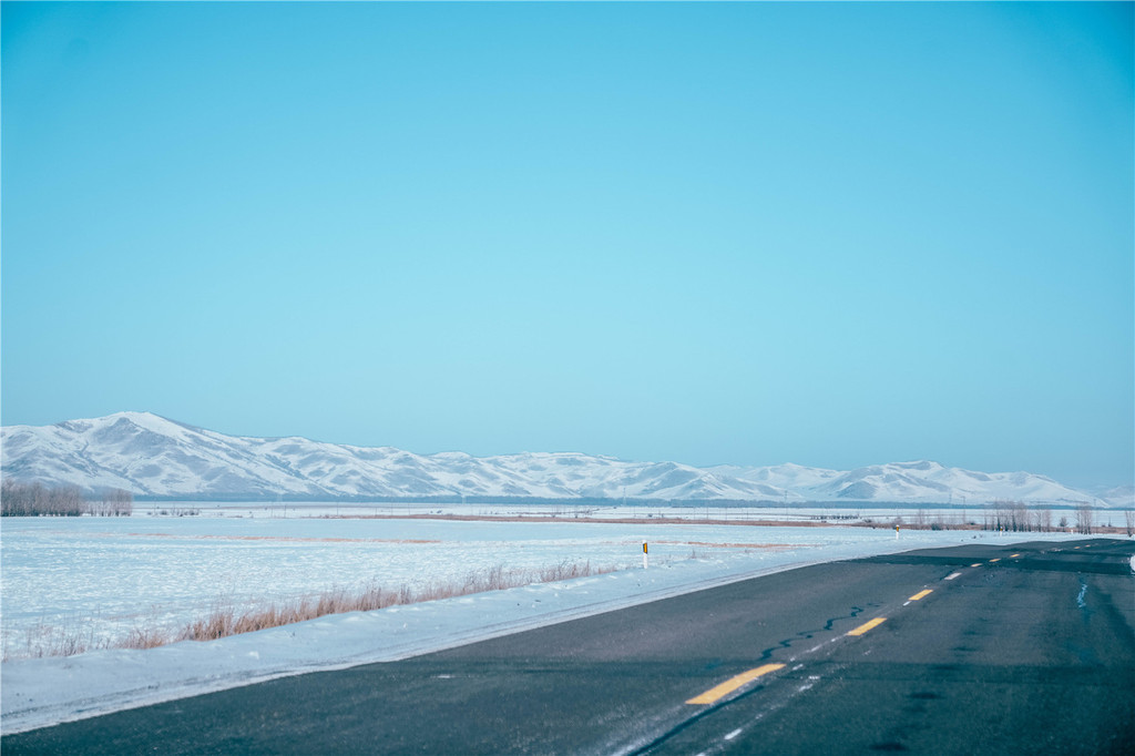 从 海拉尔 市区出发,积雪被清理堆积在道路两旁,路上的积雪被分扫在道路两旁,前面的车辆经过时卷起了漫天的雪花烟雾,瞬间与周边雪景融为一体,进入这层烟雾中如梦如幻。渐渐地窗外的风景里没有了建筑楼宇,越来越多积雪覆盖的草原呈现在眼前,夏天绿草茵茵的大草原,在冬季早已枯黄,积雪为其镀上了银白的颜色。