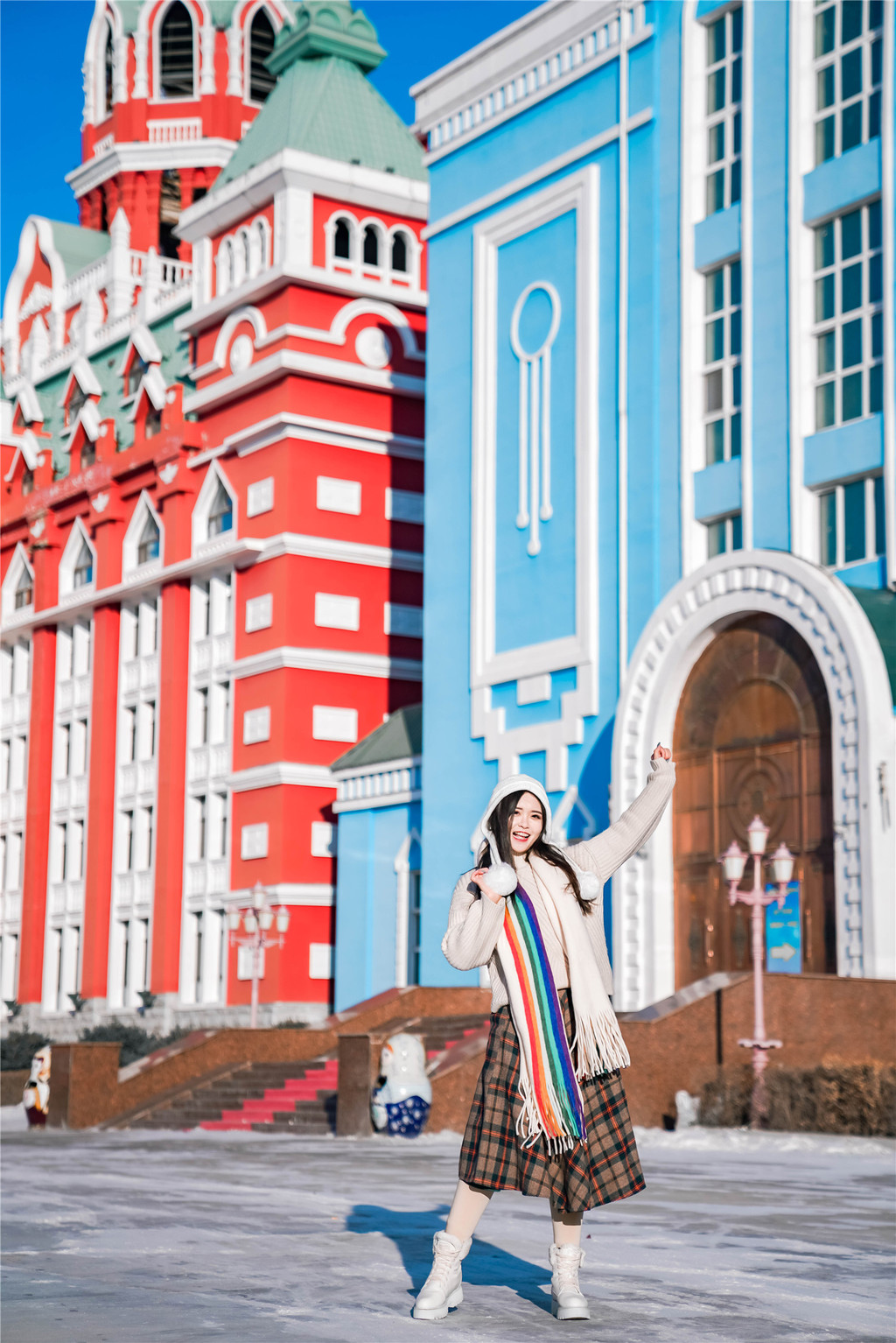 酒店旁边的广场上也有一些色彩鲜艳充满的建筑,清晨间广场地上堆满了积雪,每一座充满异域风情的建筑都让人一度以为走进绚丽的童话世界里面。