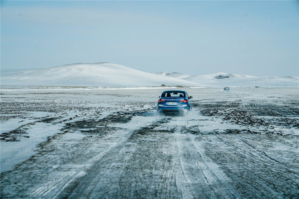 很早就想试试在冰湖面上开车是什么感受,这次终于有了这个机会。厚厚的冰面还足以承受车辆的重量,往湖面开时还有点担心,但被告知呼伦湖的冰面足有两米深时便放心大胆地往湖面开,开在冰湖上面没有一开始想象的滑。