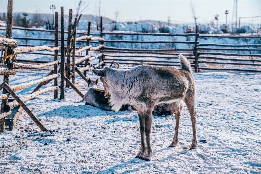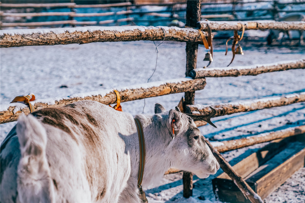 驯鹿就圈养在木围栏里面,懒洋洋地趴在雪地上歇息,沐浴着冬日里的暖阳,有几只十分给面子地站起来晃动了身子,瞬间挂在脖子处的铃铛发出清脆的声响,这些驯鹿就是拉动圣诞老人雪橇的同款驯鹿。