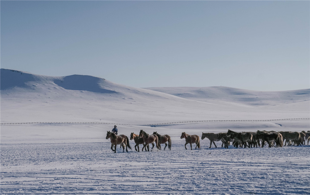 我们继续穿越大雪原,遇上了一群马群,冬天雪原里能偶遇上这么一大 片马 群是很不容易的,只能说我们真的非常幸运。奔腾的黑马在白雪上尤为显眼,扬起雪花一片。
