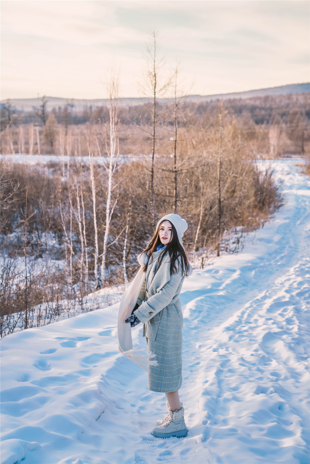 小路上都是厚厚的雪,有的地方可能不是平地,一脚踩下去不知深浅,积雪快要没过小腿,但有积雪下原来就是小路,可以放心大胆地踩上去,走进白桦林的时候,夕阳刚好变成一轮金黄,余晖透过白桦树梢散落在雪地上,星星点点的金黄在雪地上折射出好看的颜色