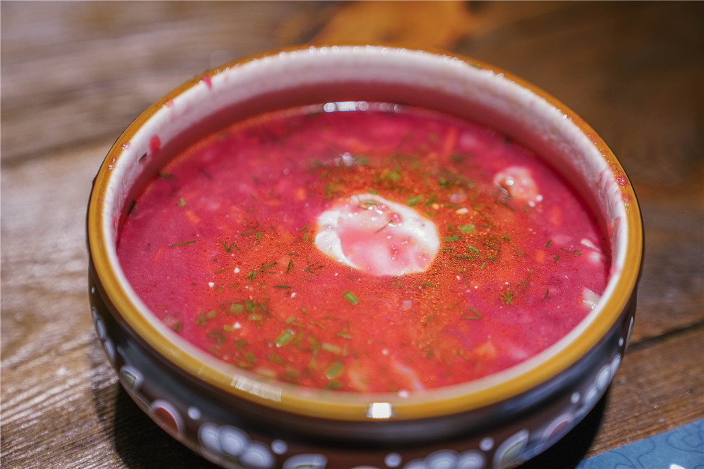 乌克兰 红菜汤,西红柿和土豆炖烂了,会舀到牛肉粒,酸酸的很开胃。卢布里奶酪包切开就是香喷喷的奶酪味,一口下去还有拉丝,奶香在口腔中四溢,是一道会让人回味的菜。