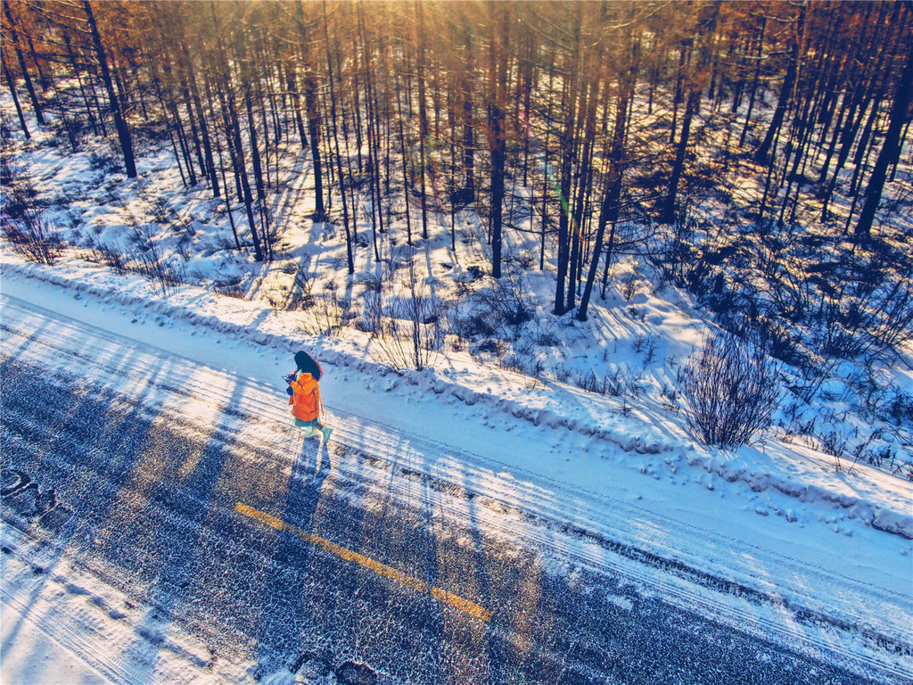 我们沿着白桦林继续往前开,也许是被路边的白桦林吸引,我们并没有目的地,一路顺着白桦林小道前行。两旁都是积雪和白桦林堆积的道路上飞驰而过,忽然遇见一条小小的可以通往白桦林的小路,我们想停下来深入白桦林中,感受 根河 冬日的静谧。