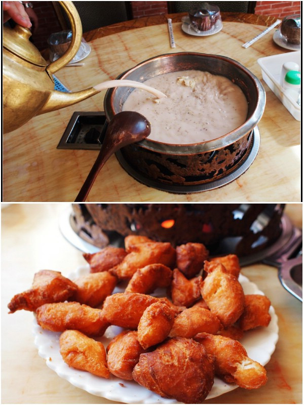 身穿民族服装的服务生来了,他把盛着白糖、盐面、蒙古果子和各色小菜的木盘摆在铜锅的四周,规整而又新鲜。他点燃火炉,先是炒茶。奶油、奶干、奶豆腐、奶皮子、炒米、肉干……一样样先后放进锅底,手拿木勺反复搅动热炒,没多一会儿就烟气腾腾,浓香扑鼻了。这时另一位服务生拎来大肚子奶壶,把已经熬熟的奶茶倒进铜锅里,待再次烧两个开后,就可以盛进木碗饮用了。这种奶茶叫蒙古锅茶。蒙古锅茶的做法很原始,热火滚烫,稀稠相宜,奶色纯朴。其味丰富、淳厚、浓香,滑润柔和,不膻不涩不腻,既可口又爽神,很快喝出满头汗水,痛痛快快,淋漓尽致。喝饮中,间或吃点青菜、糕点以及铜锅里刚煮熟的牛肉块,着实别有味道。