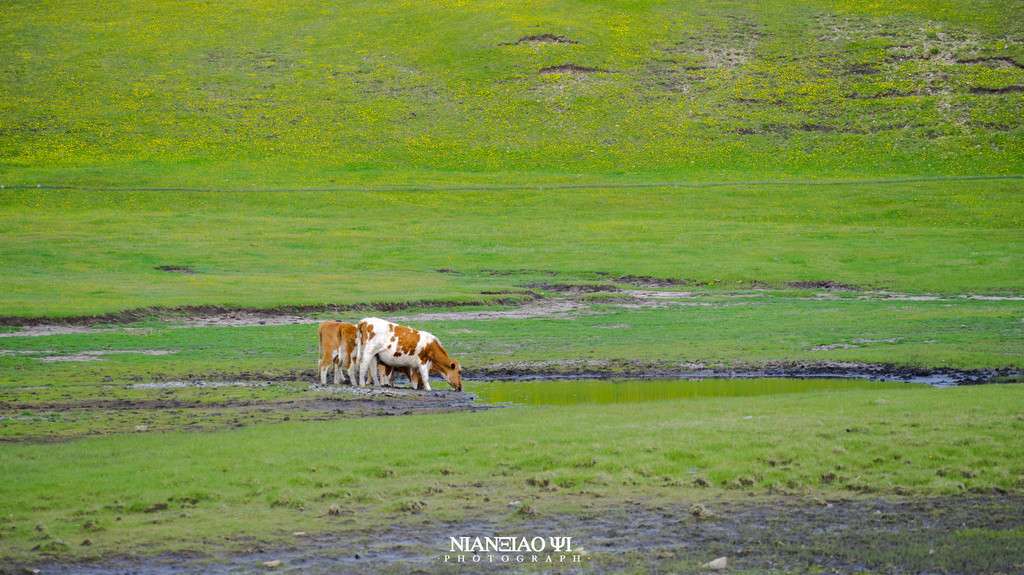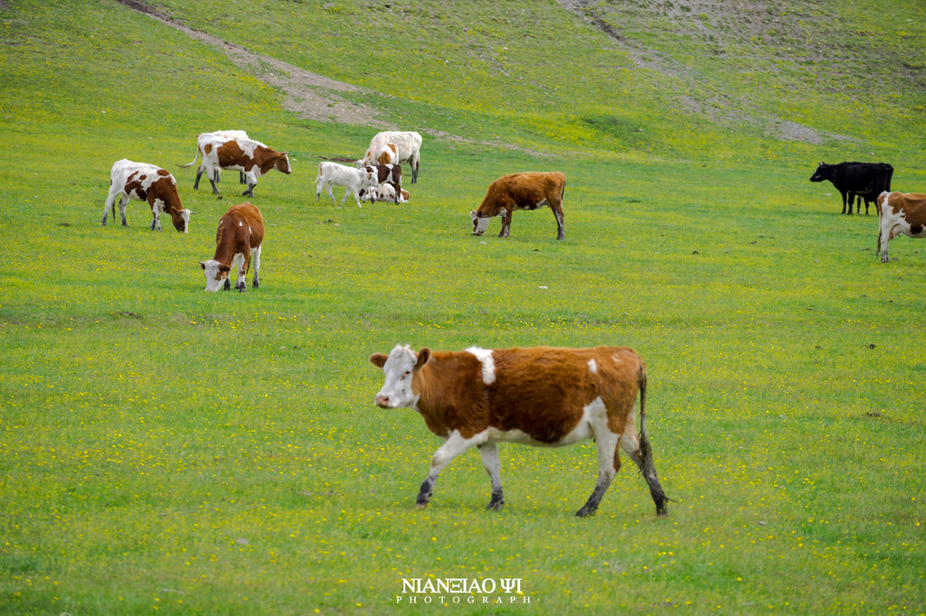 牛羊马在绿色的草地上,让画面富有生气,这时才惊觉如梦似幻的面前竟是真实的