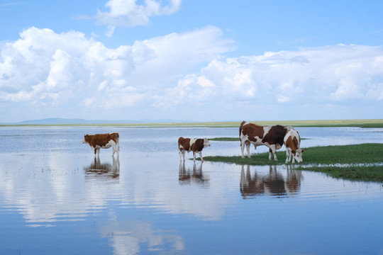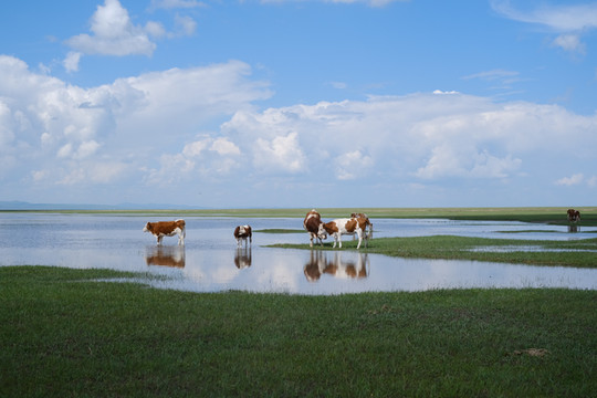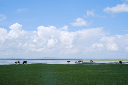 大头细尾的蝌蚪在湖畔草丛里肆意扭动,三色牛群旁若无人地滋啦滋啦低头咀嚼。