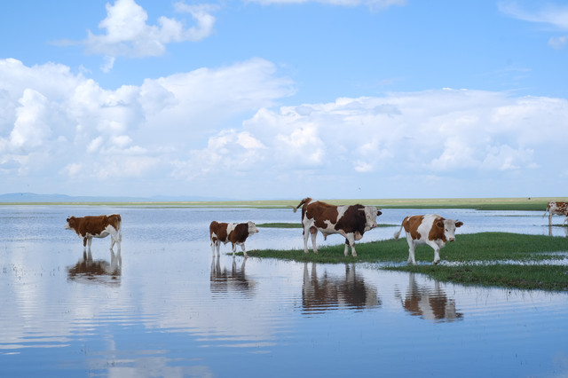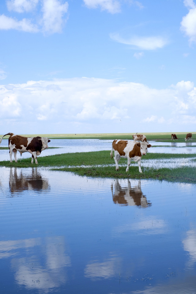 ▲遇到一个不知名的野湖,牛群在湖边啃草喝水,没有游人惊扰它们,于是想和它们合照。