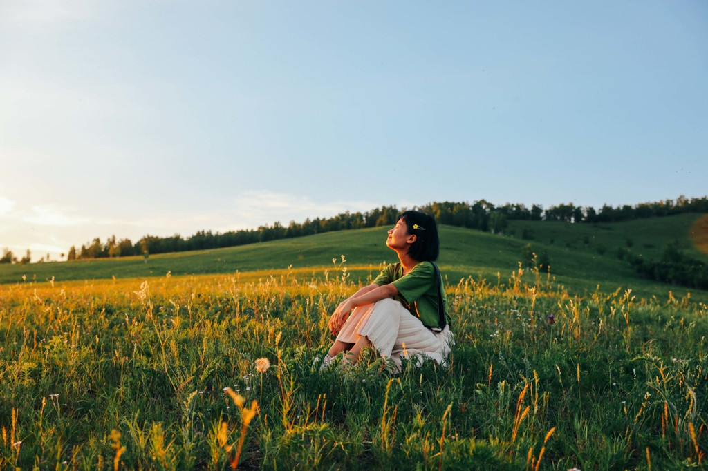 在 恩和 不知名的山坡上,一整片绿油油的草地,夕阳洒下的黄光照射着这片大地,说不出的美好,瞬间在心里蔓延开来。