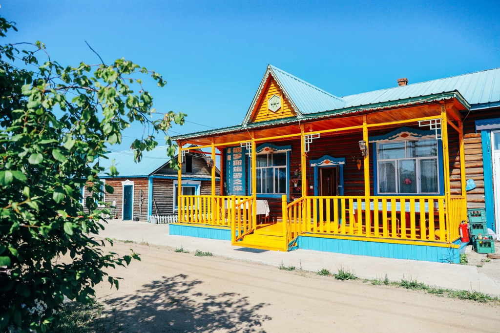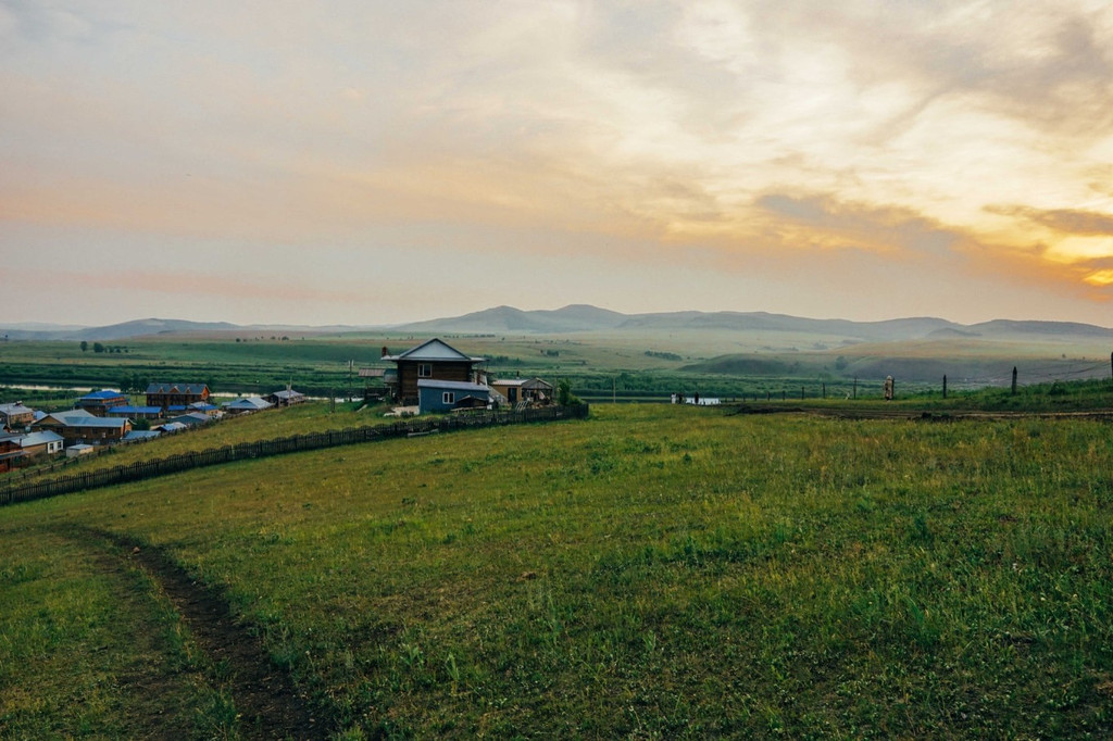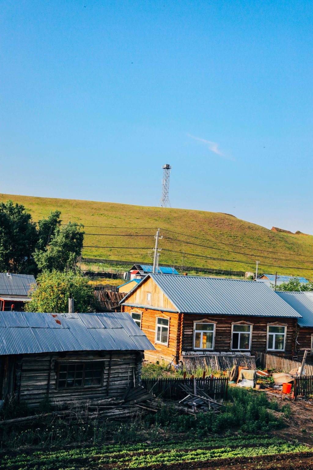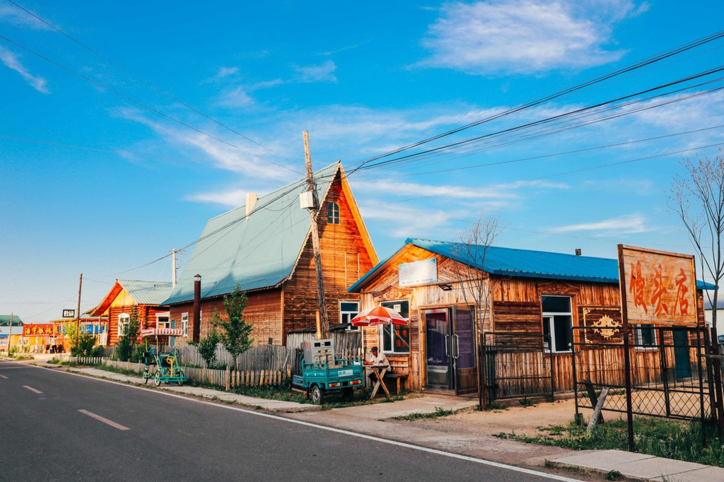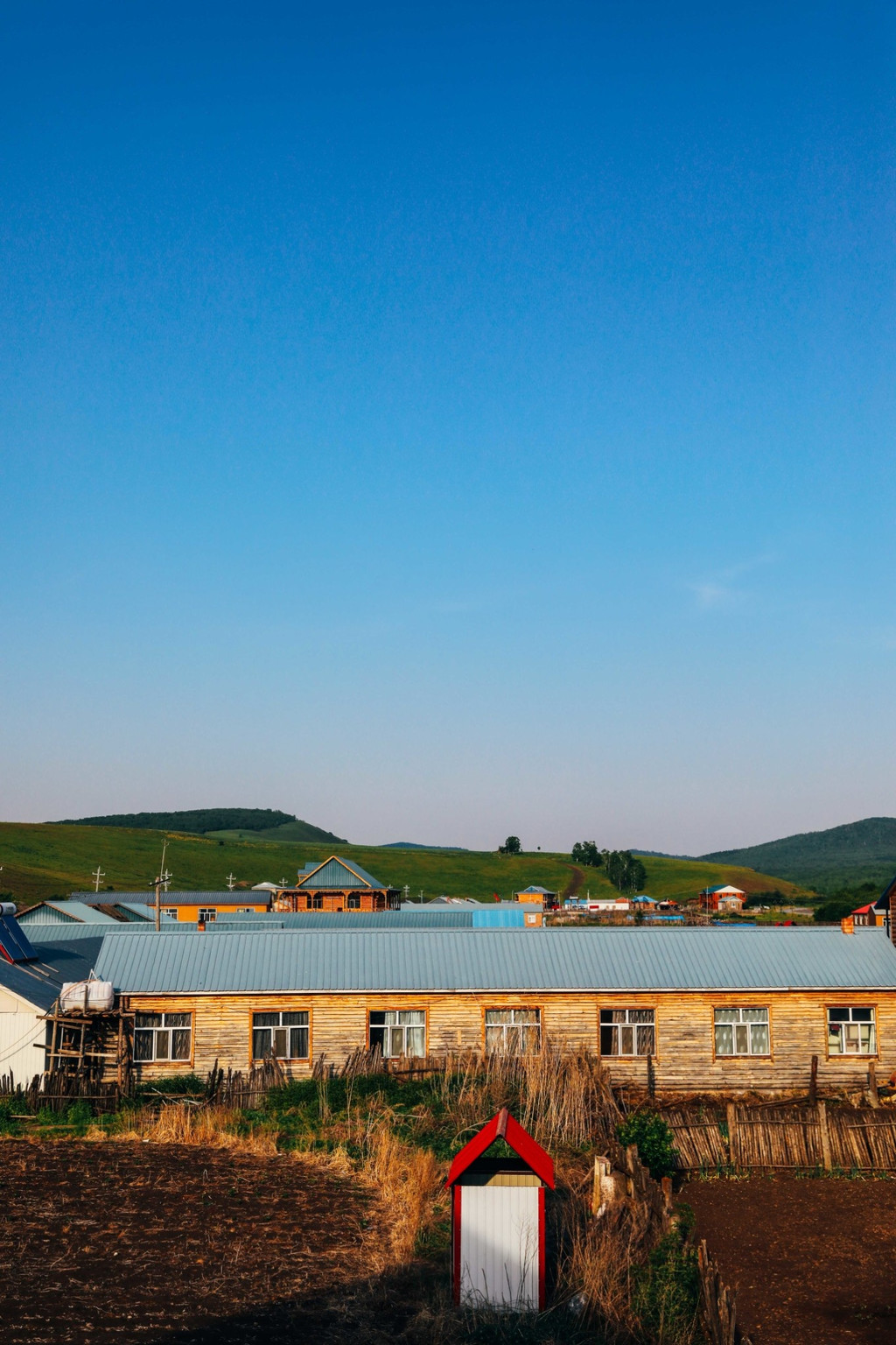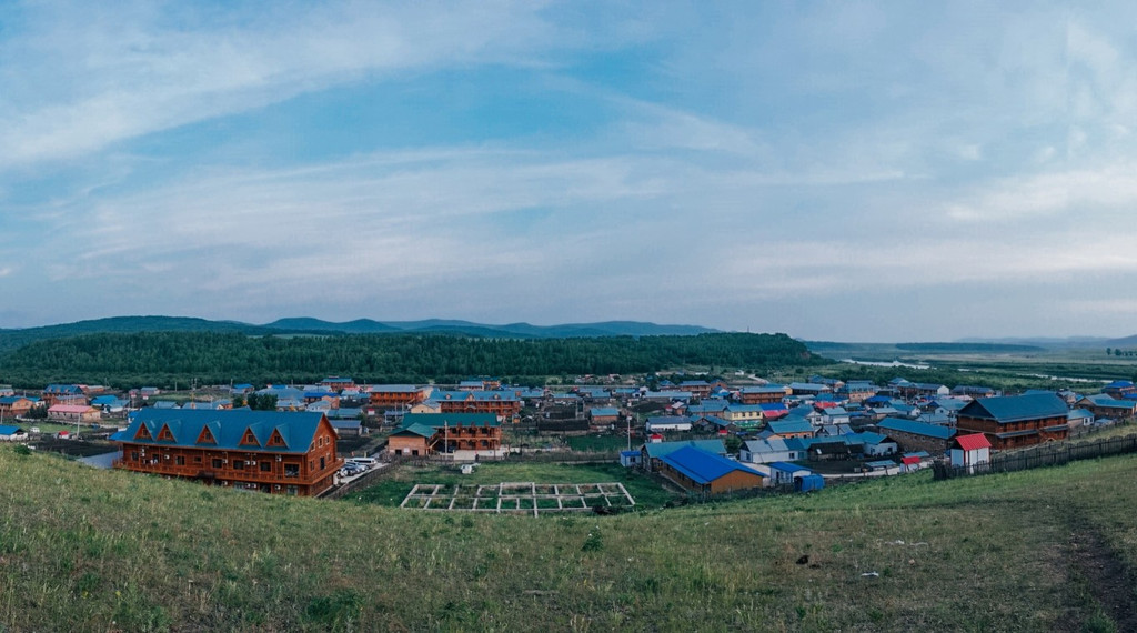 呼伦贝尔黄昏 日光 照耀下的 恩和俄罗斯 民族乡,整个村子都是木刻楞式的房子,在阳光的照射下闪闪发光,像极了油画里走出的房子。
