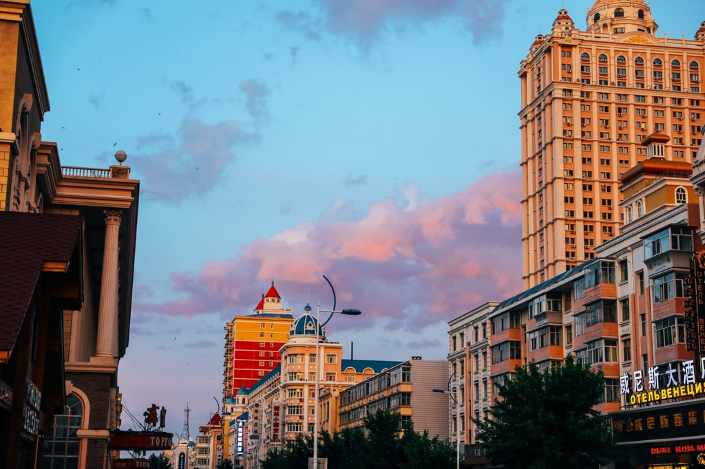 夕 阳西 下,映得天空也是粉红色的,太美了,这里有很多 俄罗斯 人出没,一个不小心,下个街口可能就会遇到美丽的 俄罗斯 姑娘,可爱的 俄罗斯 萌娃,和帅气的 俄罗斯 小伙。