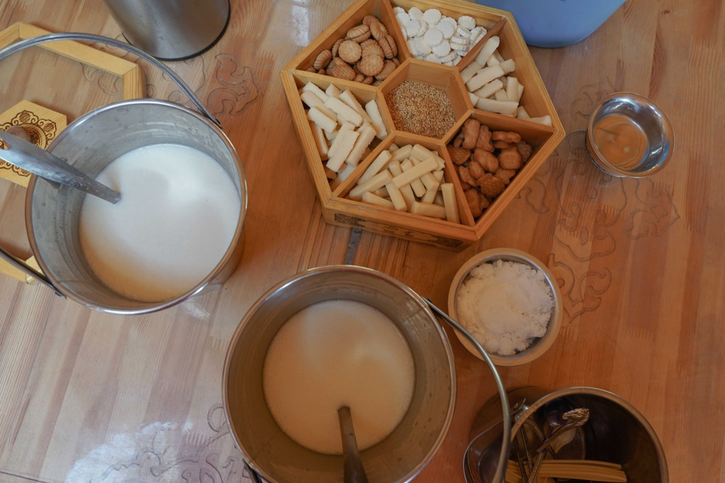 蒙古 包内,包车师傅似乎跟所有的人都很熟,主人在欢迎来客时,都会端上桶装奶,和奶棒,奶球,和一些小吃,奈何我吃不了,也就只能看看了。