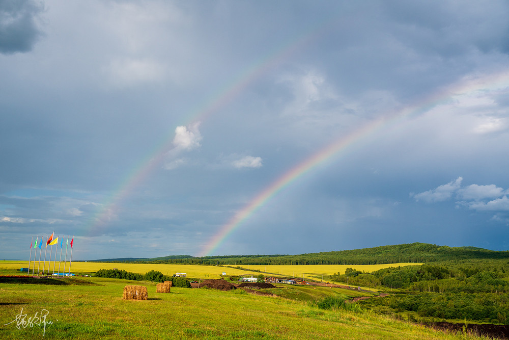 在观光车上,看着这一幕幕花海的画面,隔着额尔古纳河望向远处的室韦小镇。当时我就想,如果有人帮我拍张照留念就好了,这里真的好美。满屏的绿色草原山坡上是雨后的蓝天白云,若隐若现的彩虹悬挂在天边,一步一景不同的花海。