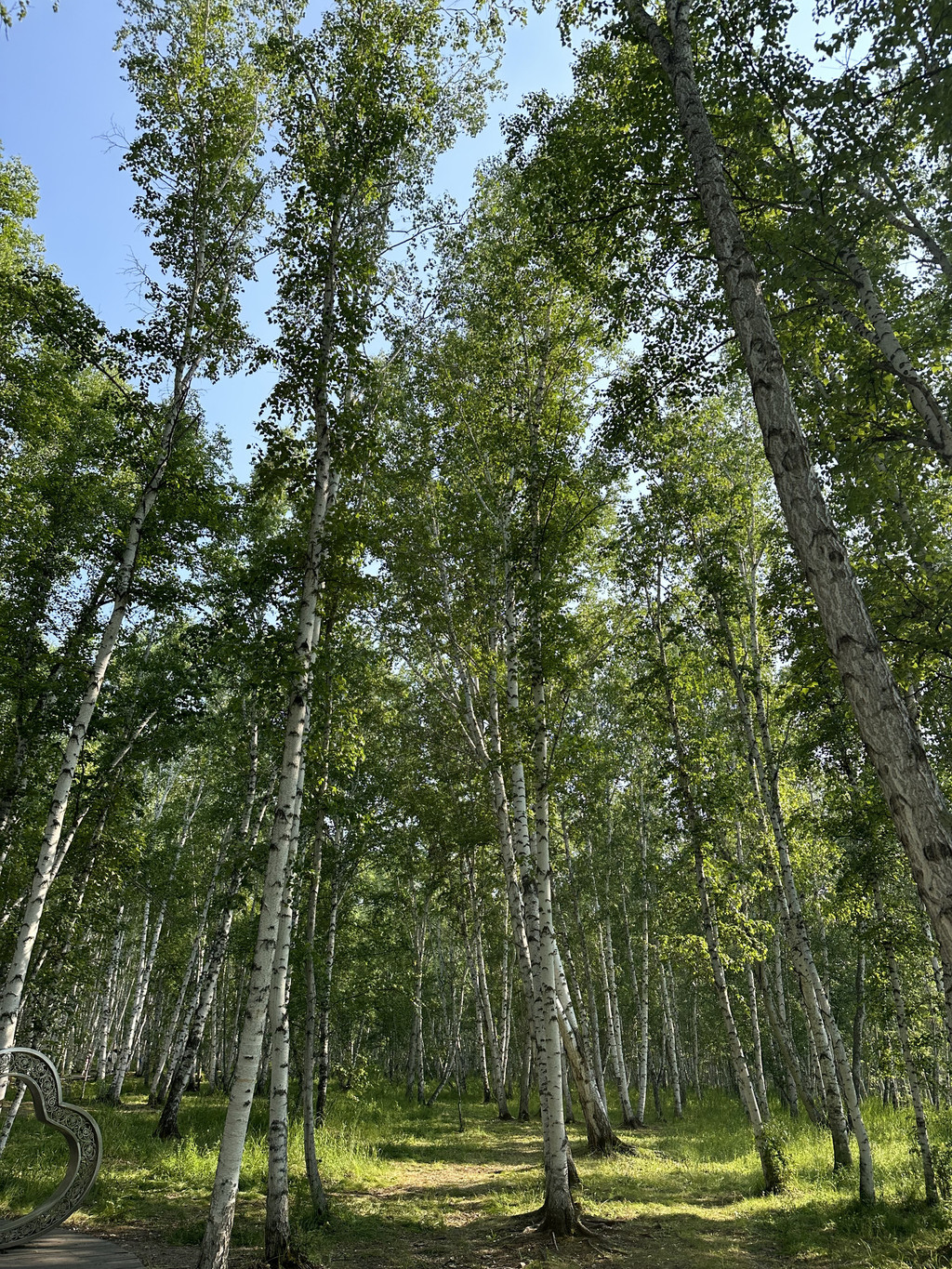 约下午2点在额尔古纳百姓饭店吃了东北菜,对于南方小土豆来说两个大菜就吃的饱饱的。饭后直接到白桦林景区,30多分钟的车程,白桦林景区很大,需要坐景交车到达林区内部,门票1.2M以下免票,但是需要买景交车票,到达指定地点下车,进入林区,成片的白桦林非常壮观,在阳光的照射下斑斑驳驳,白桦林里到处挂着注意蜱虫,说的我们怕怕的,没敢在林区里面多走,一直在木栈道上行走,打卡了秋千、玻璃桥等,适合拍照打卡,很出片,对于小朋友们来说白桦林里面的驯鹿园更有吸引力,驯鹿园里好多只驯鹿,大大小小的,买一筐鹿草可以进一大一小,我们买了两筐喂驯鹿,驯鹿长长的鹿角,看到你手里的篮筐会跑过来追着你,有点点怕的,我们跑得快它追得紧,我们在角落里找到了一只小驯鹿喂,还小心翼翼地摸了鹿角,毛茸茸的,一会儿一筐就被吃完了,我们还在鹿园里发现了花栗鼠,很可爱。