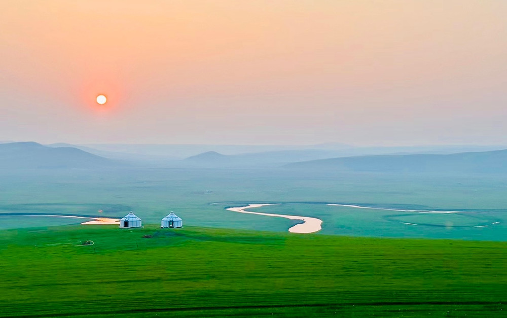 D1:飞机到满洲里(8:40-12:50),飞机提前到达——满洲里机场租车,携程平台订的捷达一年内新车,经济好用,草原上蚊虫多,车行特地嘱咐要少开窗。满洲里满眼都是套娃,小朋友们很兴奋。提车后我们直接高速到海拉尔德盛大酒店办理入住,一路上风景非常好,视野很开阔,草原,牛羊,还有湿地景观都在眼前。晚餐我们是在诺米塔拉吃的,奶茶和羊腿必点,味道不错。这里的日落较杭州晚很多,晚餐后约6点,我们驱车前往老舍笔下的天下第一曲水——莫日格勒河看日落,路程比我想象中要长一些,莫日格勒河景区也非常大,来不及到第三观景台,我们在第一观景台看了日落,人不多,风景非常漂亮。