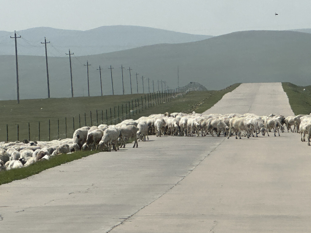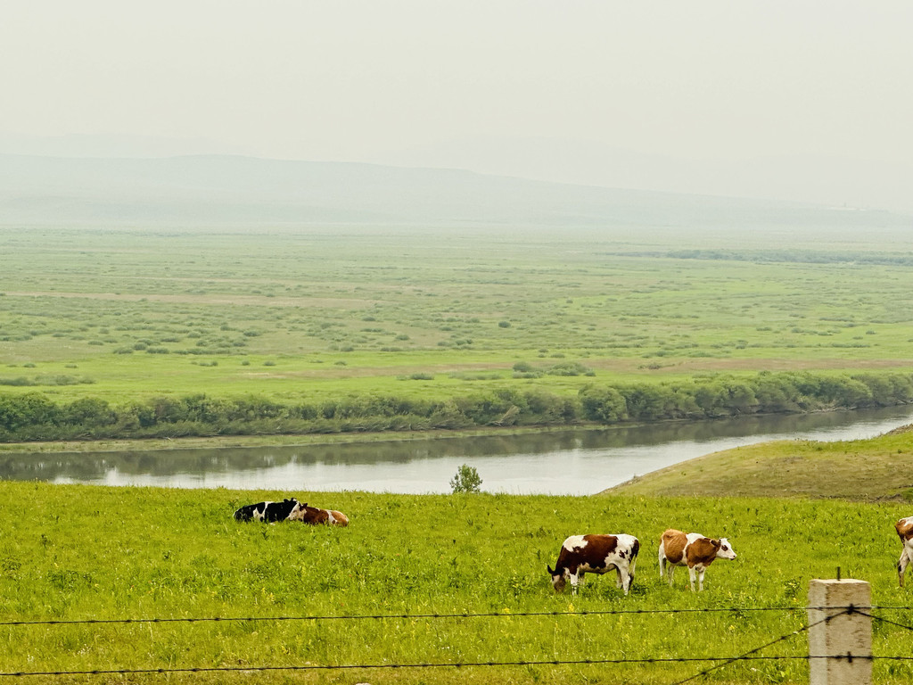 接近11点的时候,我们看到远处山坡上有汽车,就想着去断崖,就是莫日格勒河的另一面近距离看看,我们跟随着导航到了断崖,但是断崖被铁丝网围着,我们就远远的看了一下,这是一条乡道,当地出租车司机告诉我们直接沿着这条水泥乡道就可以到达额尔古纳市区,果不其然,在这条乡道上看到了不一样的风景,成群的牛羊过马路……车少景美,走走停停,非常漂亮。