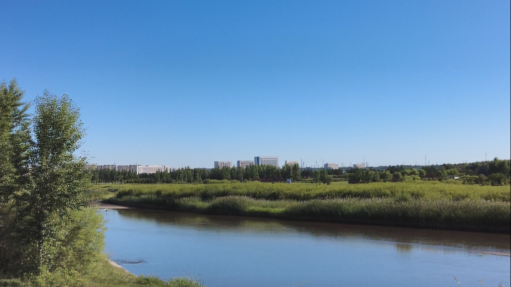 从河西岸远望东岸城市行政办公区,到这里伊敏河完全进城,再往北流淌12公里,伊敏河汇入海拉尔河一同向西转向,又没入草原之中。