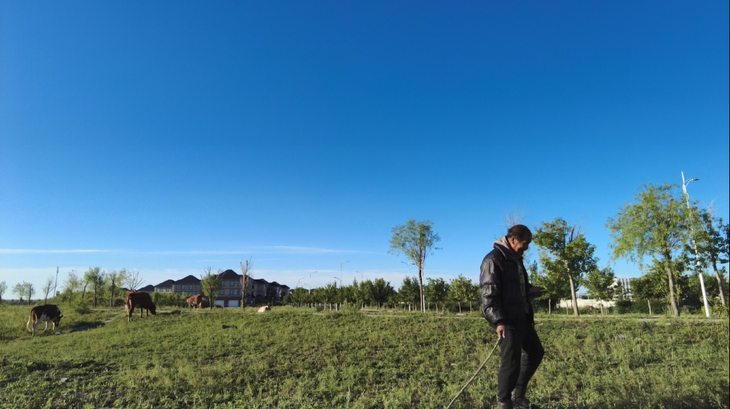 近处的牛群,牛倌,远处的别墅——草原城市,与草原渐行渐远。