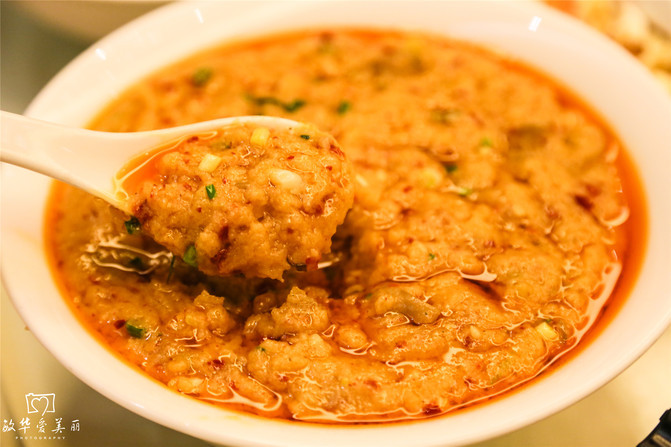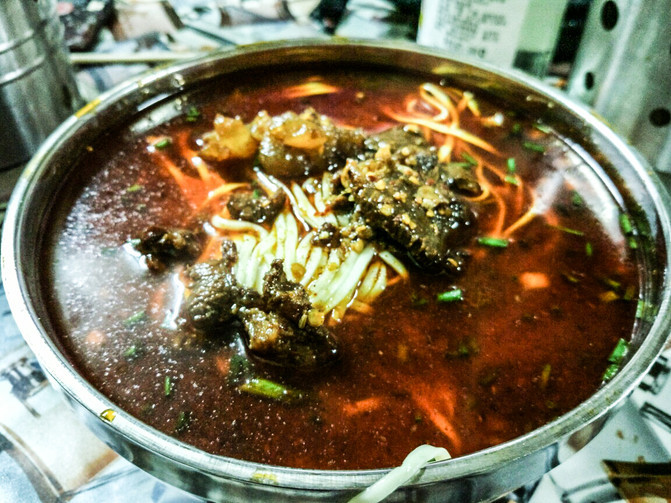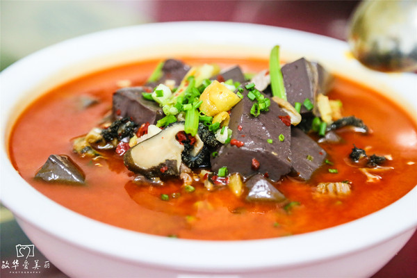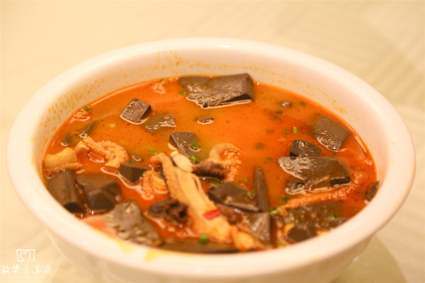 红艳艳一片的汤与四川的毛血旺甚是相似。