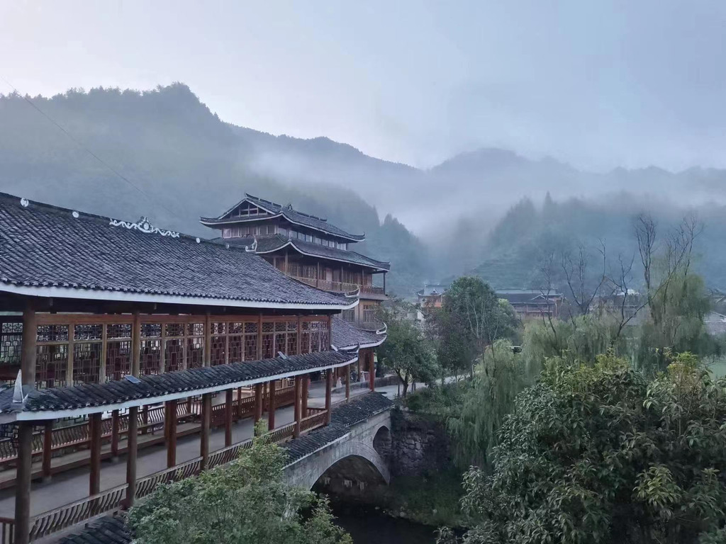 这是令人神往的世外 桃源 ,清晨的村庄在袅袅烟云里曼妙抖落,徐徐露出真容。一幢幢小木楼或挨挨挤挤,或独居山旁,散落在四周都是群山的谷地中,袅袅炊烟飘向空中;一条条小溪水或沿路边或沿房屋或沿田地汩汩流淌,奔向卯溪。