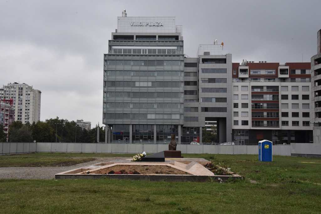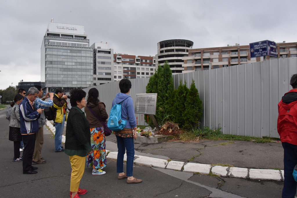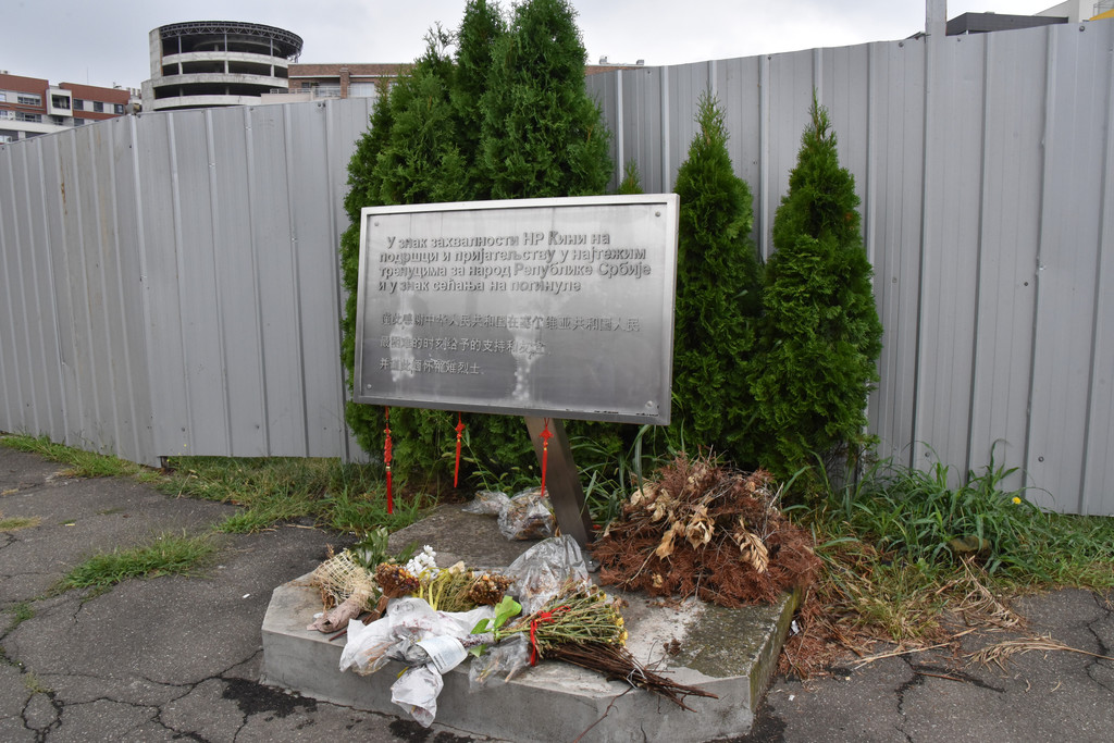 围挡外街角处地上还有一块金属牌,上面用当地文字和中文写着:谨此感谢中华人民共和国在塞尔维亚共和国最困难的时刻给予的友谊和支持,并谨此缅怀罹难烈士。地上有些已经枯萎的鲜花,有人来此凭吊烈士。